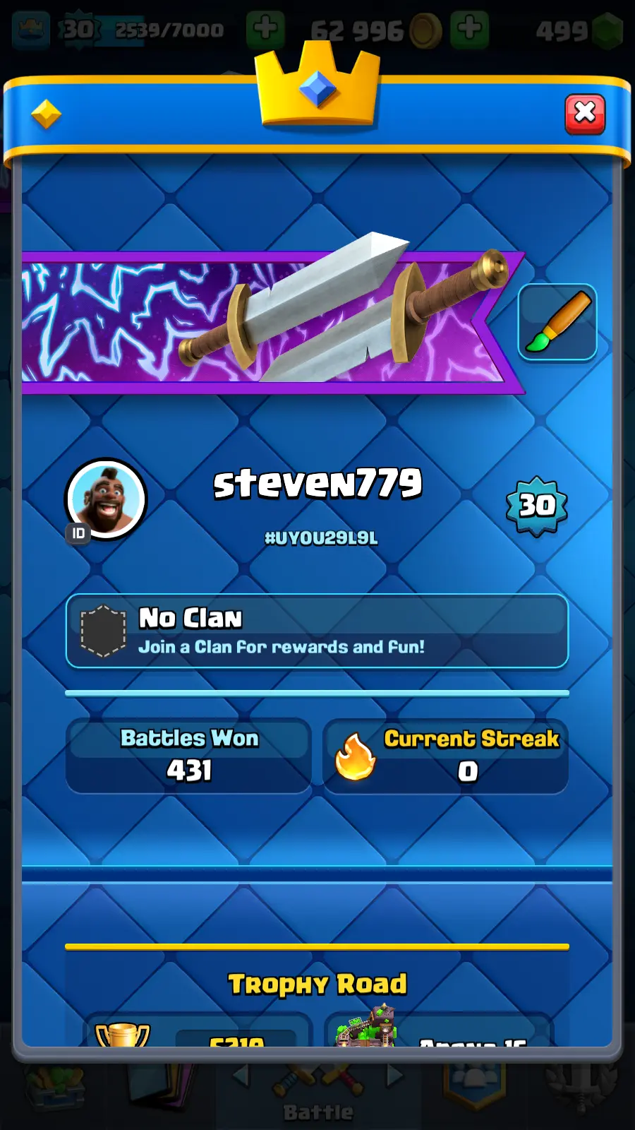 CL6953 KT 11 LEVEL 30 | 5 Evolution | Trophies:5219 | 106 Cards | 1 Cards (12LVL) | 1 Tower Skins | 14 Emotes | 62K Gold | 499 Gems | IOS/ANDROID