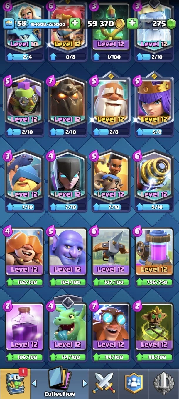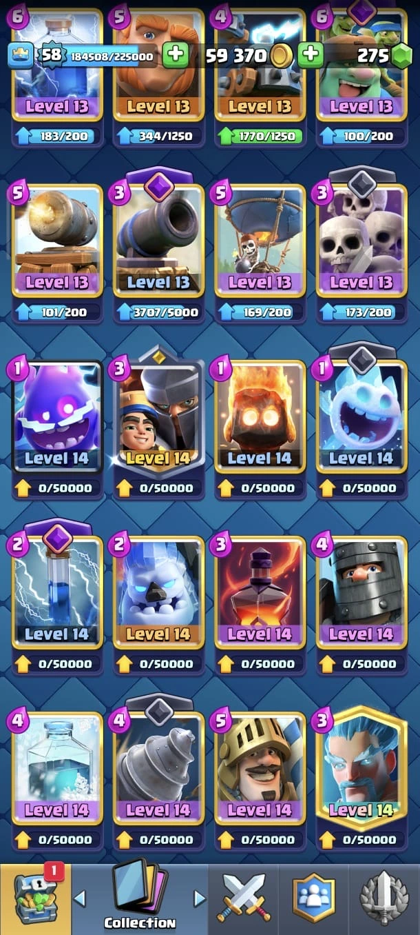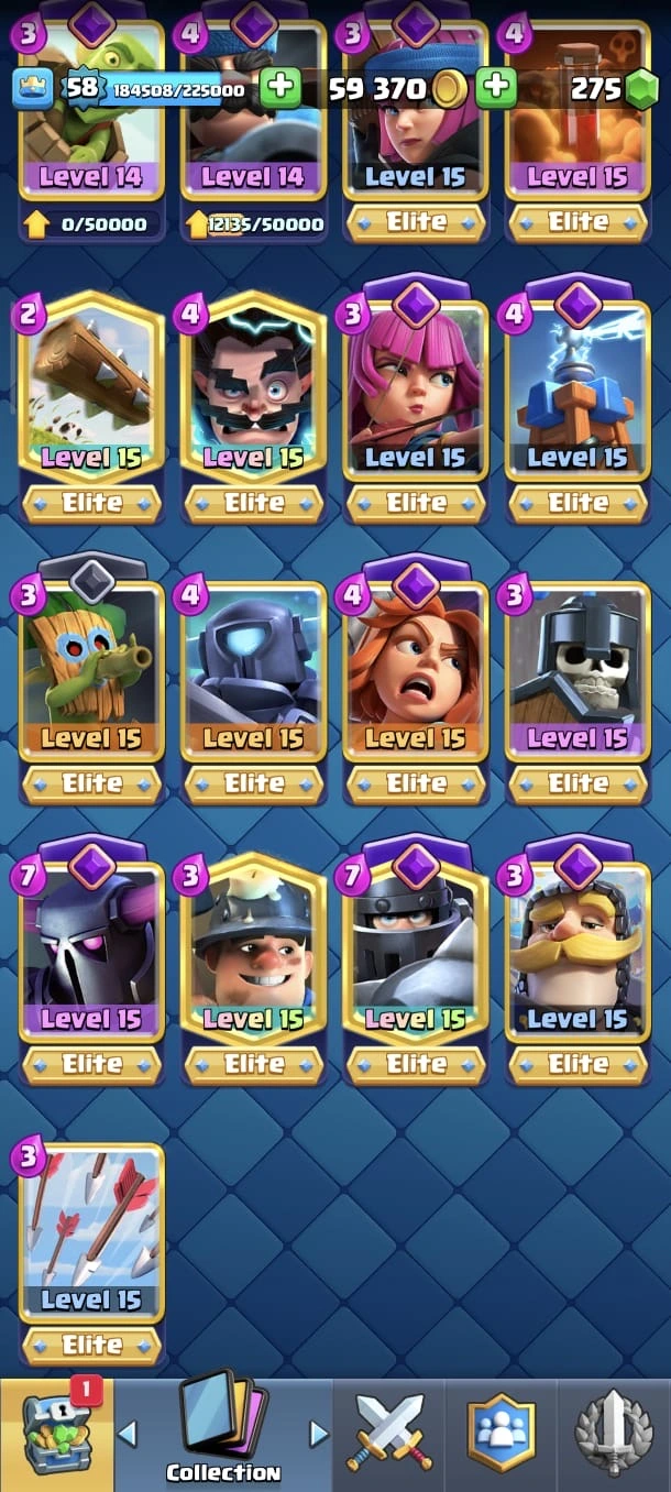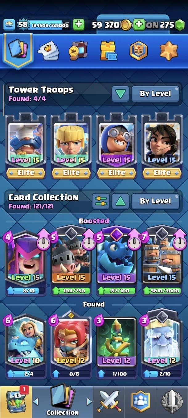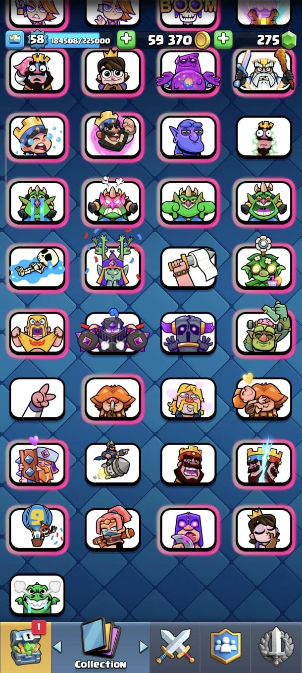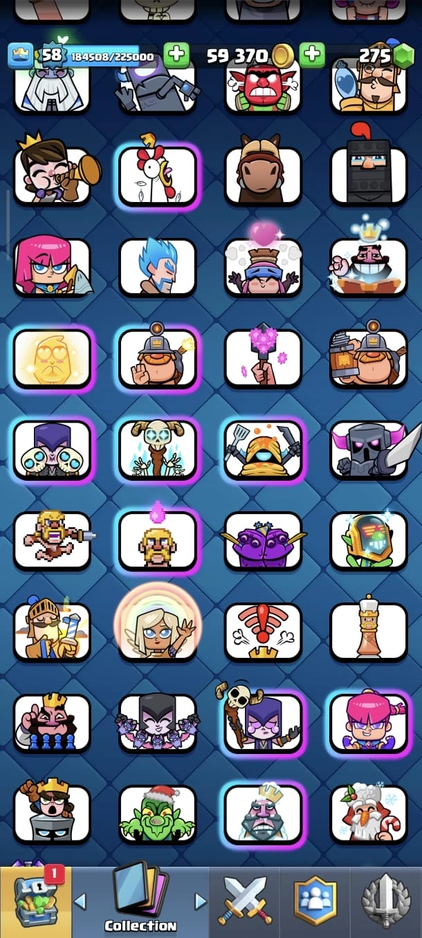 CR LV 58 🔥 Evo 20 🔥Max Cards 49 🔥 Elite 15 🔥 Emote 118 🔥 Trophy 9589 🔥 Change name 500 🔥 Cheap & Safe account🔥