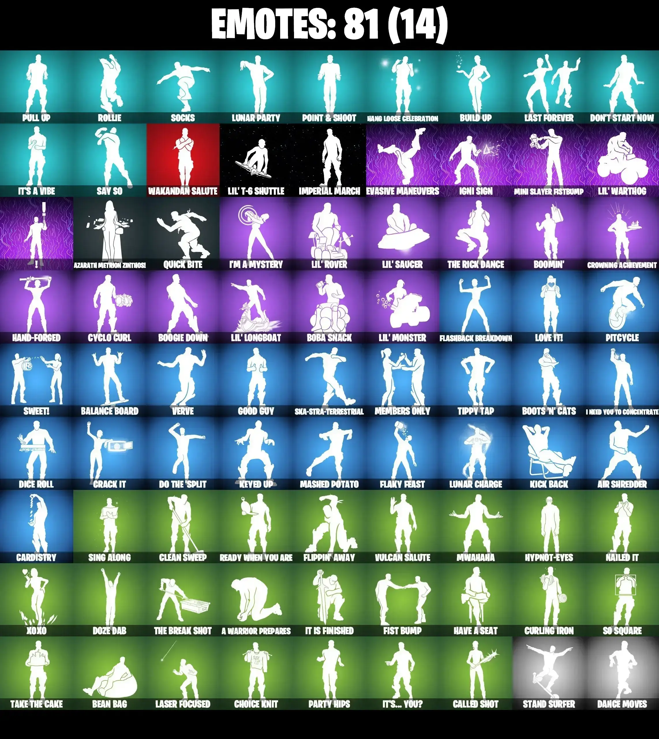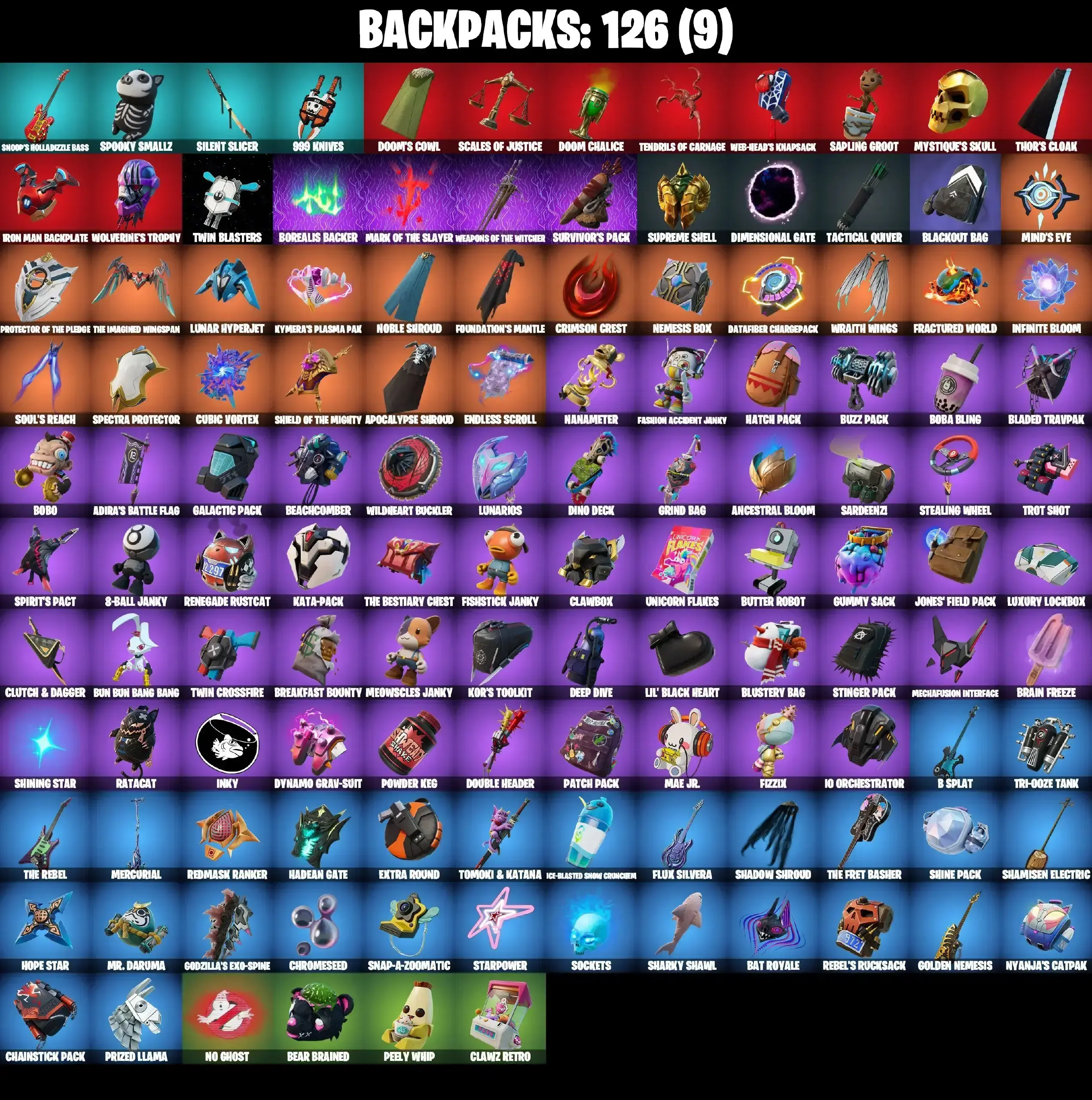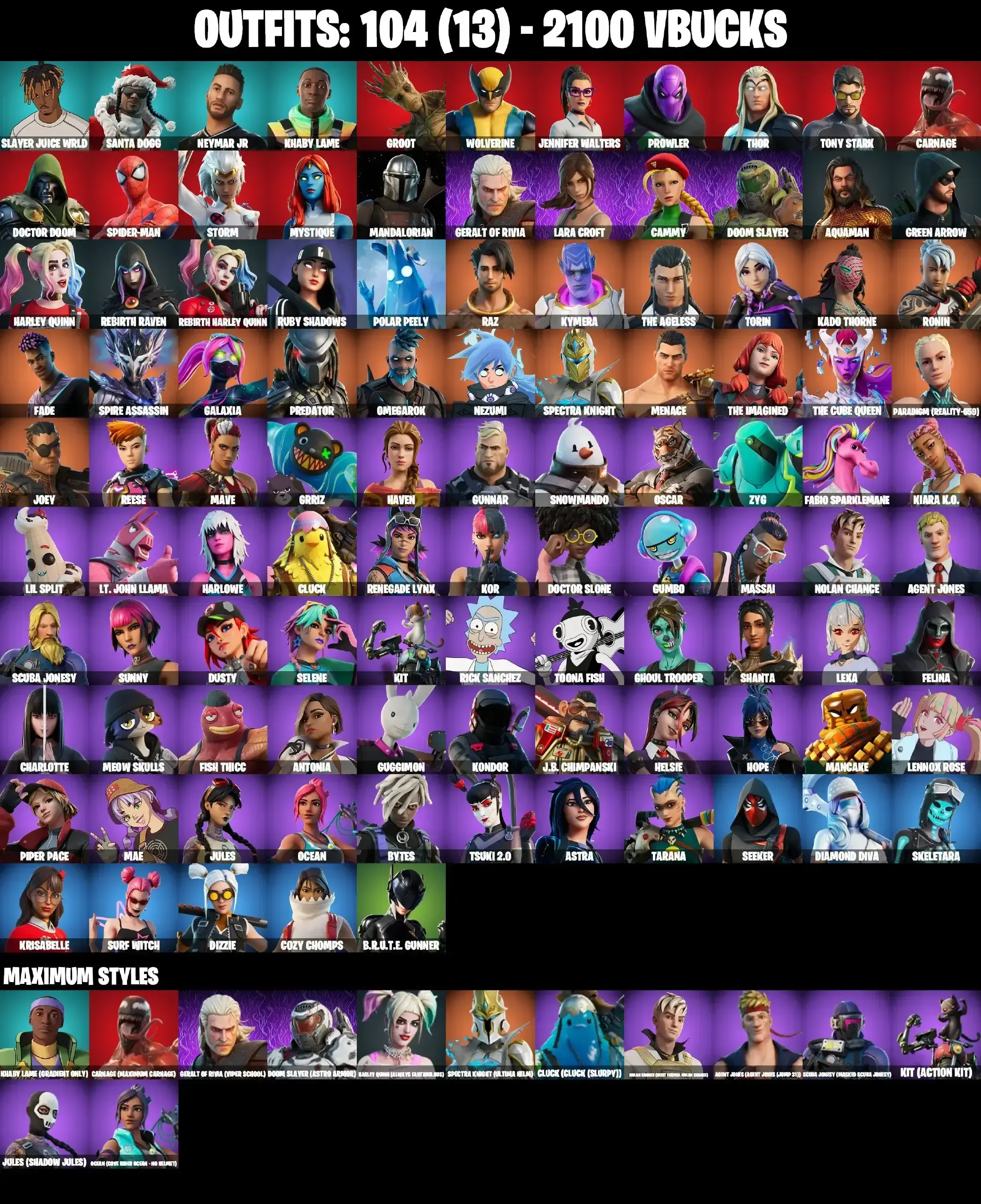 104 SKINS | CAMMY | GHOUL TROOPER | SPIDER-MAN | MANDALORIAN | LARA CROFT | GALAXIA | PREDATOR | HARLEY QUINN MAX | HELSIE | CHARLOTTE | TSUKI 2.0 | JULES | TOONA FISH | CAN PLAY ON PSN,XBOX,PC,NINTENDO,MOBILE | 2100 VBUCKS | F