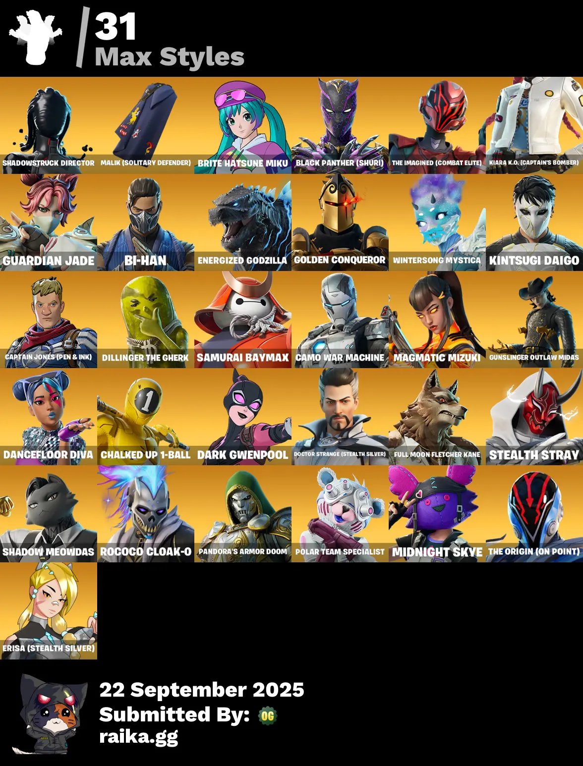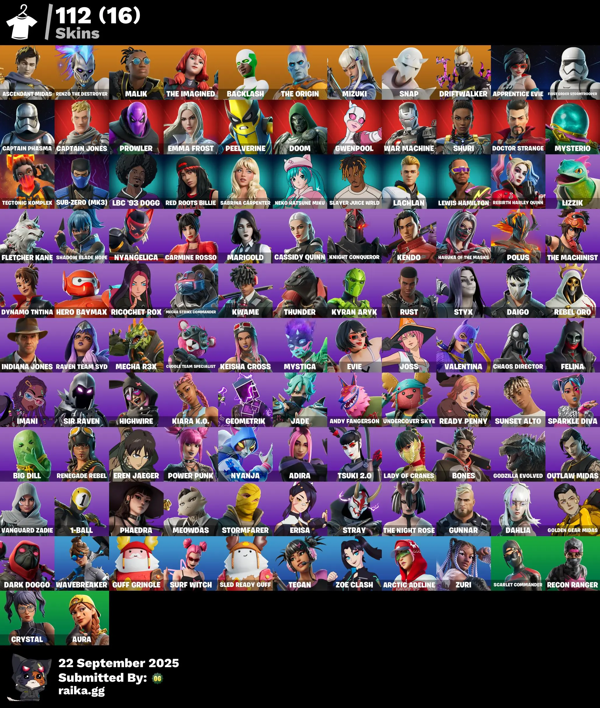 112 skins | Driftwalker🎃Bird Call🎃Doctor Strange🎃Captain Jones🎃Snap🎃The Imagined🎃Shuri🎃Apprentice Evie🎃Ol' Woody🎃The Origin🎃Malik🎃Ascendant Midas🎃Peelverine🎃First Order Stormtrooper🎃Captain Phasma🎃Mysterio🎃Renzo the Destroyer D4828