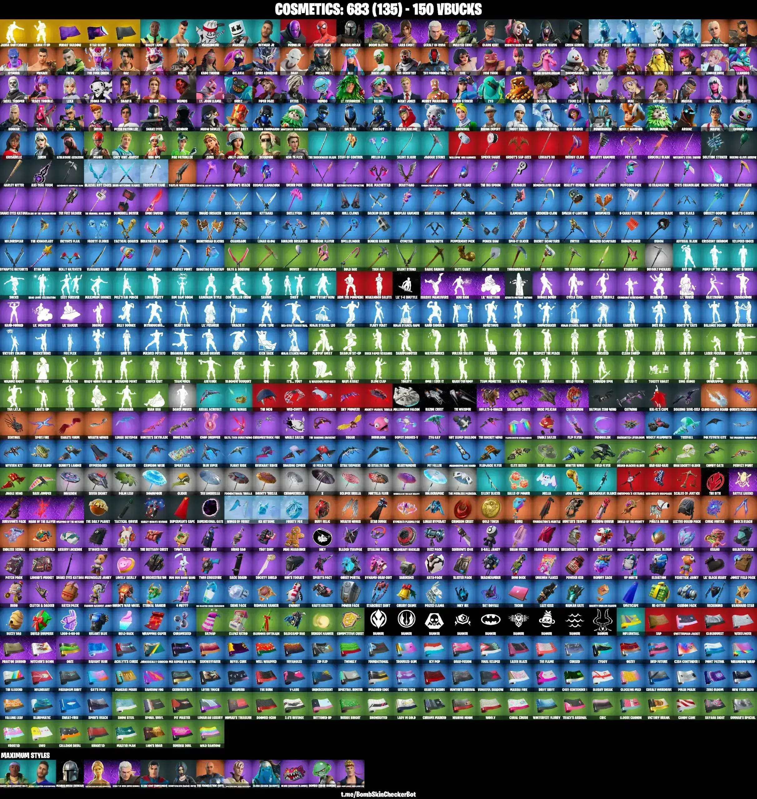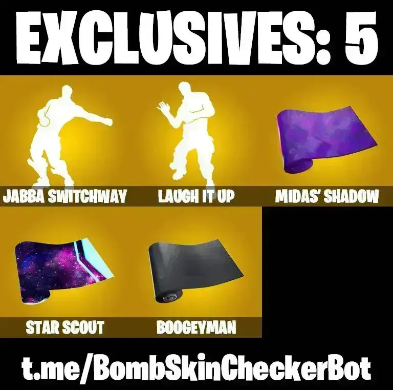 114 SKINS | JABBA SWITCHWAY | BACKLASH | SNAKE EYES | GOLDEN LARA CROFT | FULL BESKAR MANDALORIAN | RACHEL ROTH | TRACY TROUBLE | MASTER CHIEF | SKULL TROOPER | SPIDER-MAN | LAUGH IT UP | INTRODUCING | STAR WAND | PREDATOR | VI |