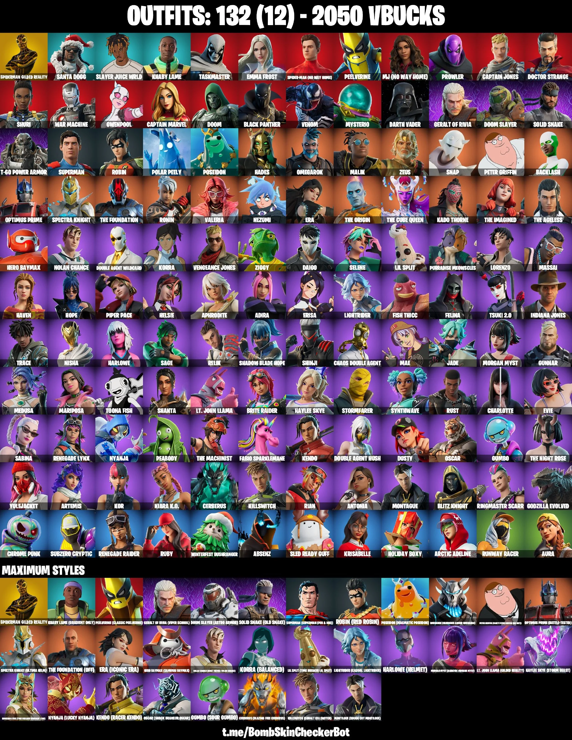 🔮132 Skins🔮 Star Wand💎Darth Vader💎Backlash💎Aura💎Erisa💎Polar Peely💎Krisabelle💎Doctor Strange💎Toona Fish💎Khaby Lame💎Spiderman (Gilded Reality)💎Doom Slayer💎Geralt Of Rivia