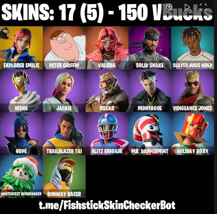 ๐ฅ 17 skins [PC/PSN/XBOX] ๐ค Explorer Emilie ๐ช Peter Griffin ๐ Valeria ๐ Solid Snake ๐ค Slayer Juice WRLD ๐ Nisha โ๏ธ Jackie ๐ Oscar ๐ฆธ Montague ๐ธ| AGCFN140