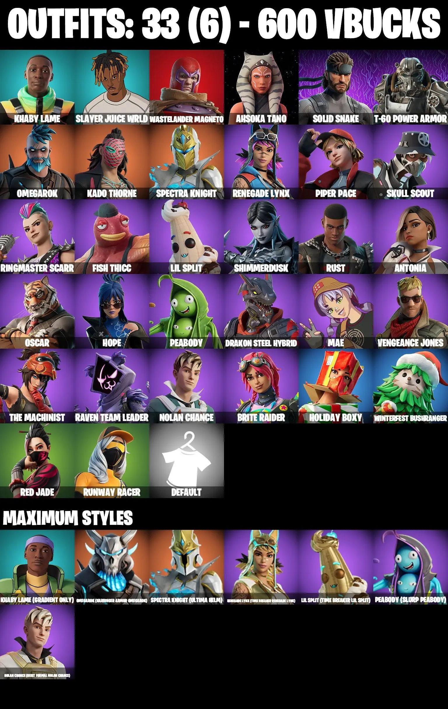 33 SKINS | AHSOKA TANO | SKULL SCOUT | SHIMMERDUSK | DRAKON STEEL HYBRID | HOPE | RED JADE | SLAYER JUICE WRLD | STARLIT | CAN PLAY ON PSN,XBOX,PC,NINTENDO,MOBILE | 600 VBUCKS | FULL EMAIL ACCESS