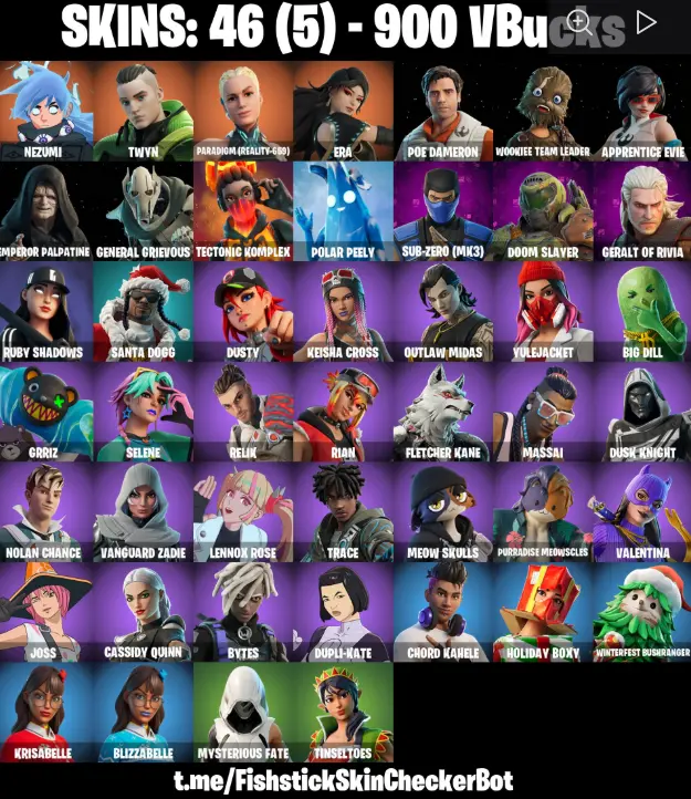 ๐ถ46 skins [PC/PSN/XBOX] โจ Nezumi ๐ค Twyn ๐ซ Paradigm (Reality-659) ๐ Era ๐ Poe Dameron ๐พ Wookiee Team Leader ๐ฏ Apprentice Evie ๐ Emperor Palpatine ๐ฐ 900 VBucks | AGCFN138