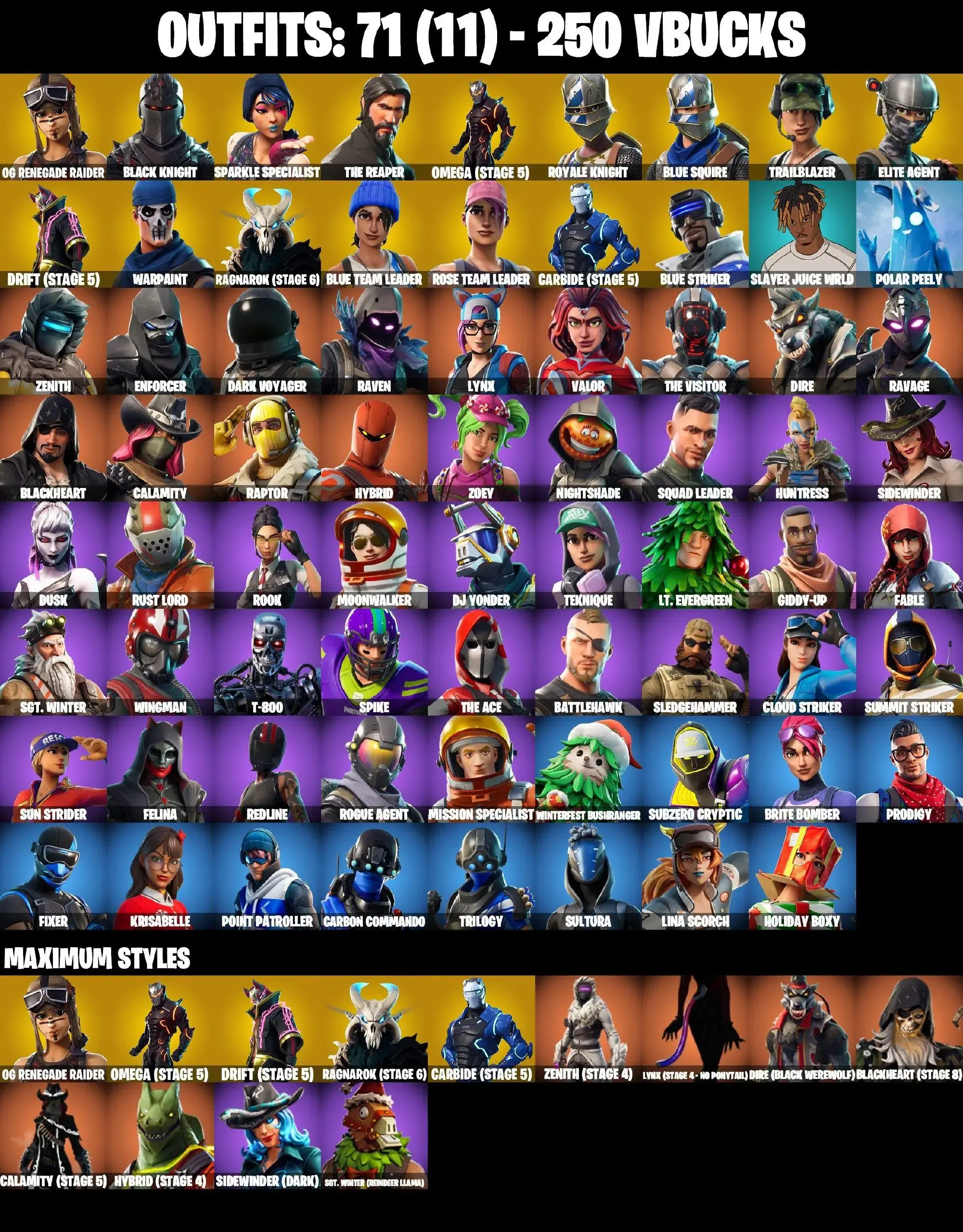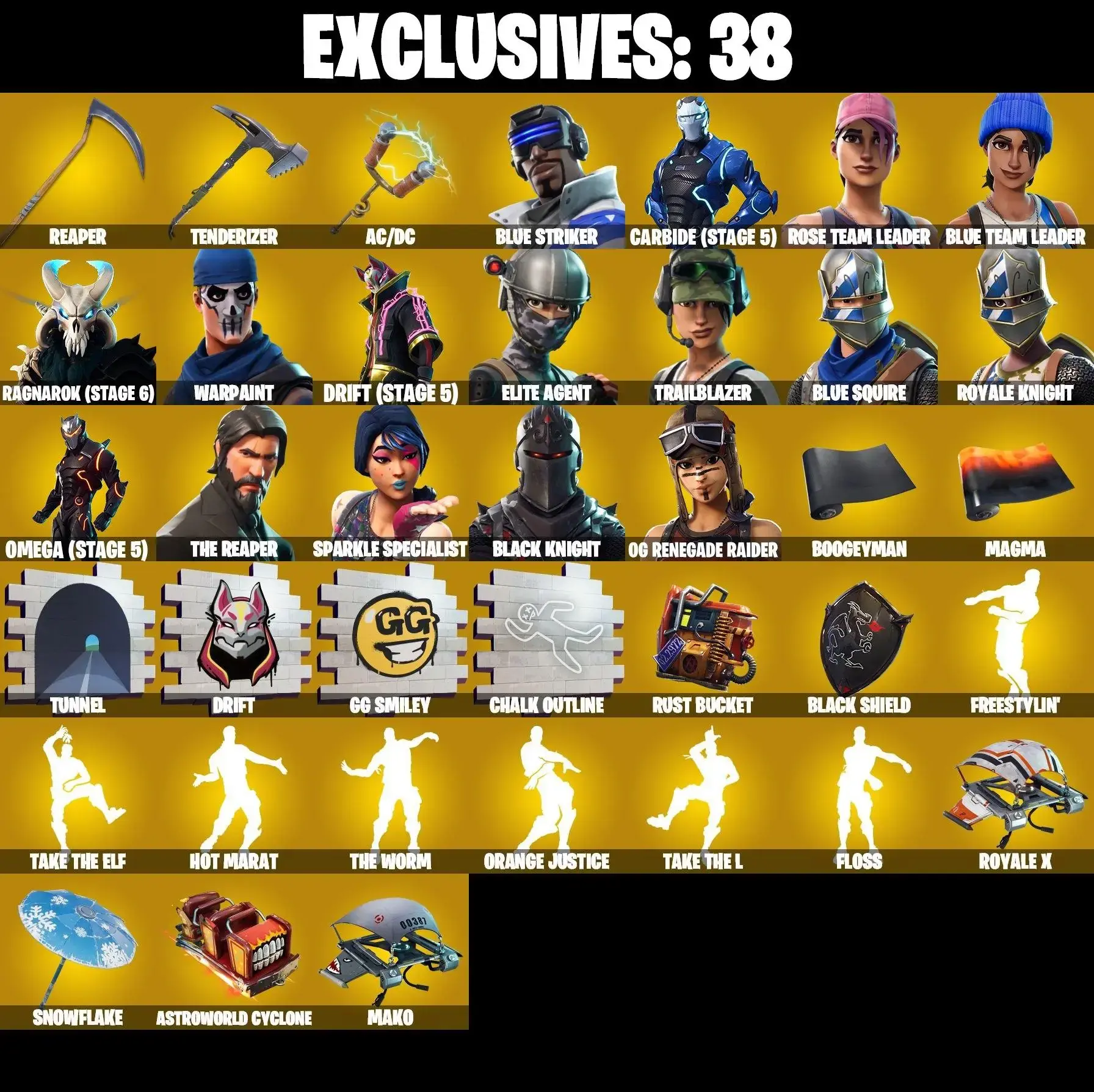 71 SKINS | OG RENEGADE RAIDER BLACK & GOLD | BLACK KNIGHT | ROYALE KNIGHT | BLUE SQUIRE | TAKE THE L | AMKO | THE REAPER | OMEGA STAGE 5 | TRAILBLAZER | FREESTYLIN | ELITE AGENT | FLOSS | THE WORM | SPARKLESPECILAIST | OG STW FOUN