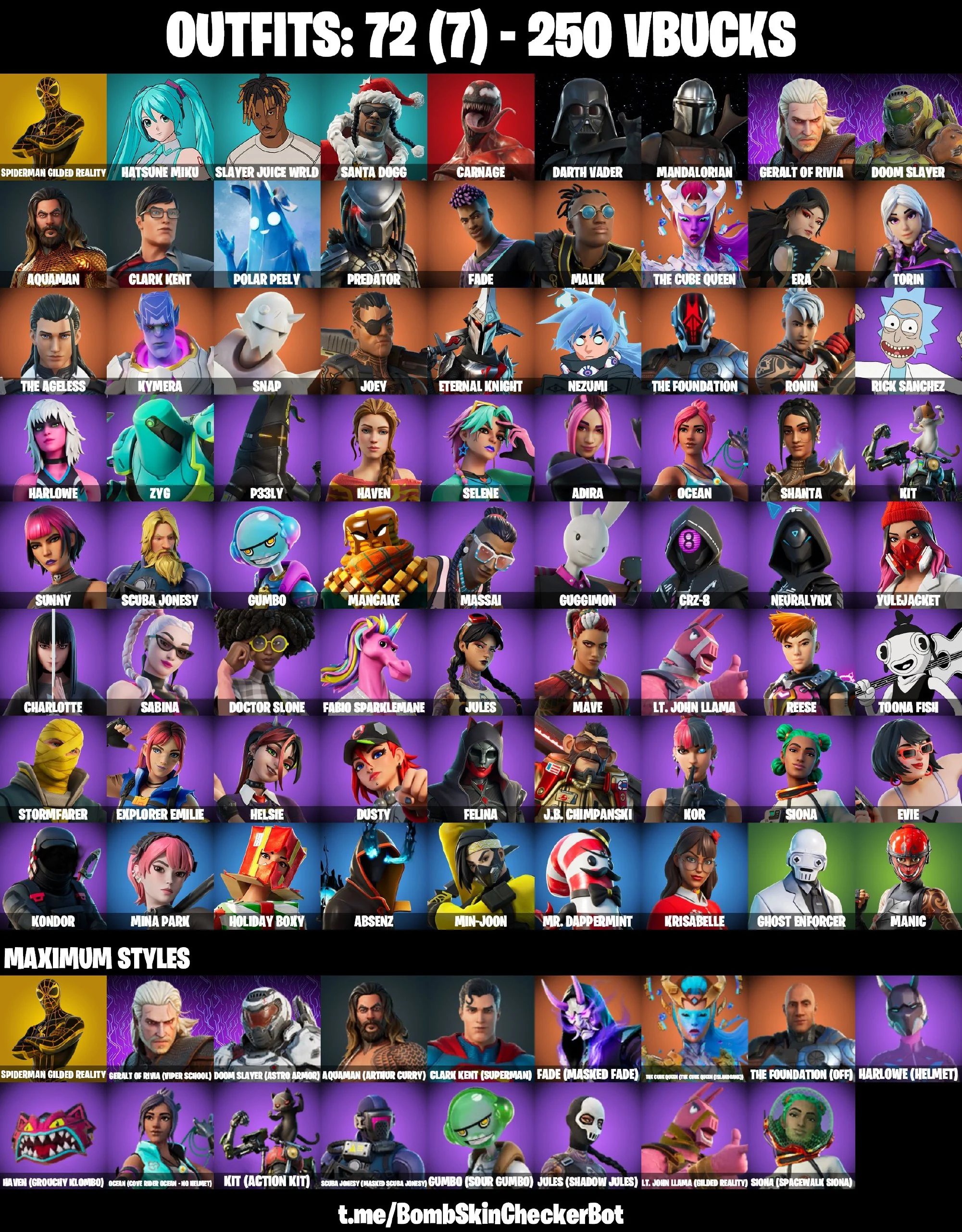 🔮72 Skins🔮 Darth Vader💎Jules💎Clark Kent💎Polar Peely💎Krisabelle💎Rick Sanchez💎Predator💎Toona Fish💎Spiderman (Gilded Reality)💎Mandalorian💎Doom Slayer💎Geralt Of Rivia💎P33ly💎Manic💎Siona💎Ocean💎Slayer Juice Wrld💎Holiday Boxy