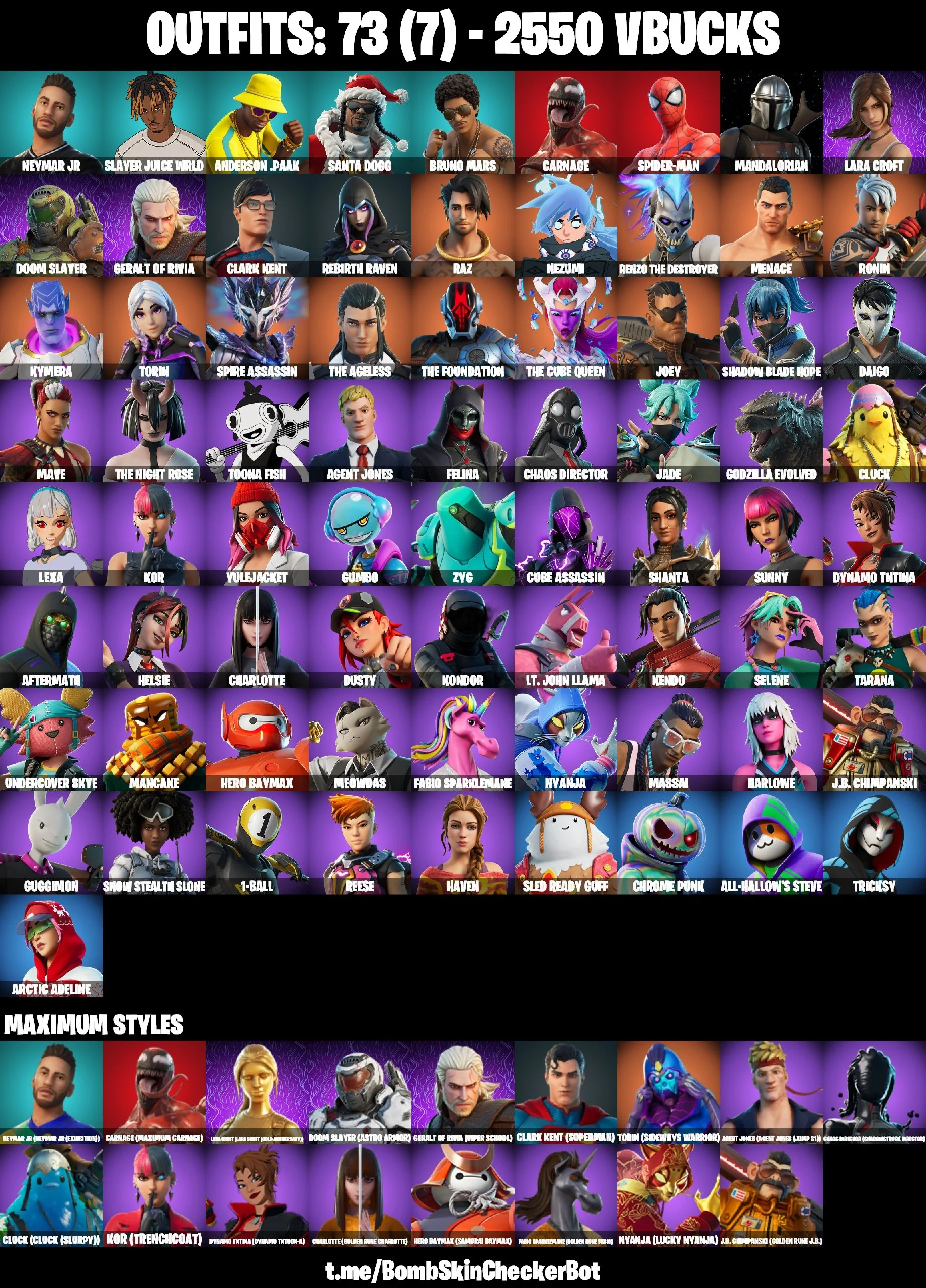 🔮73 Skins🔮 Lara Croft💎Neymar Jr💎Clark Kent💎Toona Fish💎Spiderman💎Mandalorian💎Bruno Mars💎Doom Slayer💎Geralt Of Rivia💎Slayer Juice Wrld💎Arctic Adeline💎Sled Ready Guff