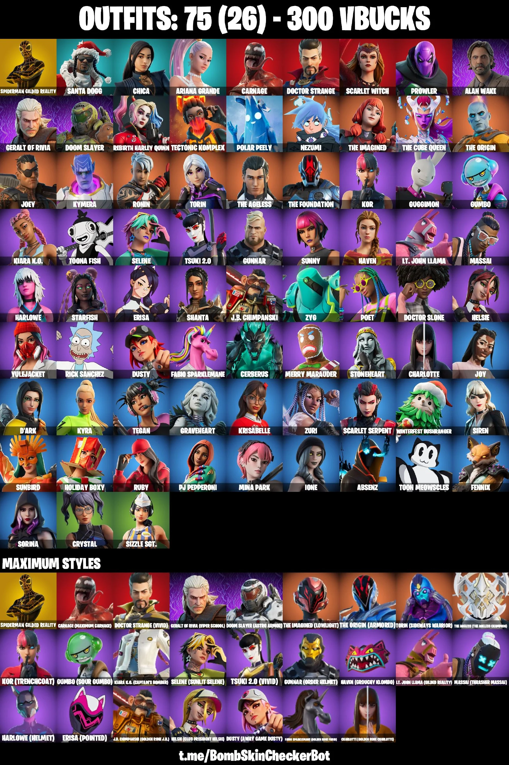 🔮75 Skins🔮 Chica💎Ariana Grande💎Rebirth Harley Quinn💎Crystal💎Erisa💎Tegan💎Polar Peely💎Krisabelle💎Doctor Strange💎Rick Sanchez