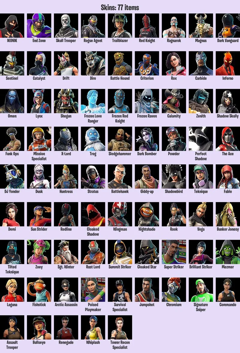 77 Skins|IKONIK|End Zone|Skull Trooper|Rogue Agent|Trailblazer|Red Knight|Ragnarok|Magnus|Dark Vanguard|Sentinel|Catalyst|Drift|Dire