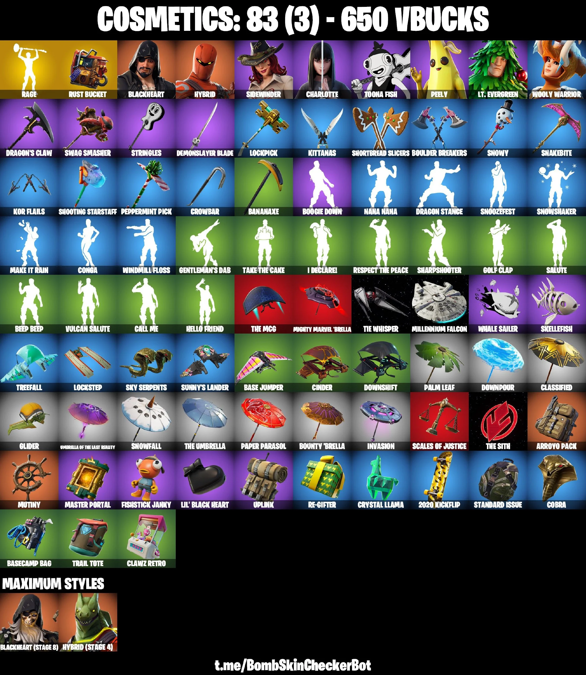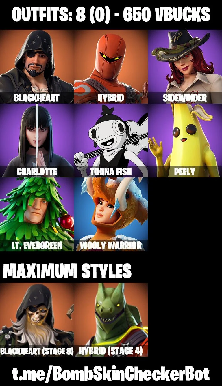 ✅8 Skins✅ Rage , Rust Bucket , Crowbar , Peely
