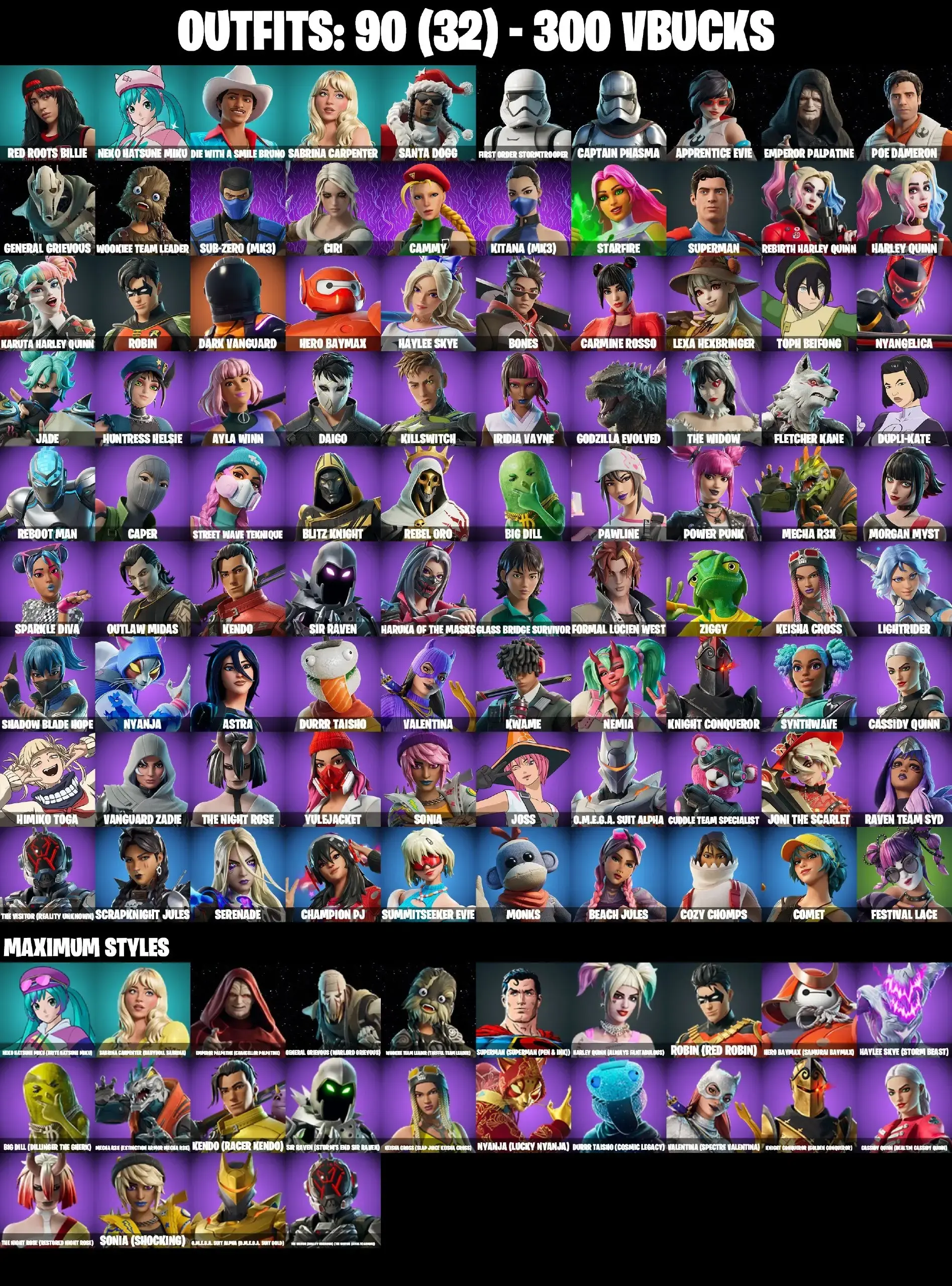 90 SKINS | CAMMY | KITANA MK3 | CIRI | STARFIRE | RUSHIN AROUND | OUTLAW MIDAS | THE WIDOW | KARUTA HARLEY QUINN | FIRST ORDER STORMTROOPER | CAPTAIN PHASMA | APPRENTICE EVIE | EMPEROR PALPATINE MAX | POE DAMERON | GENERAL GRIEVOU