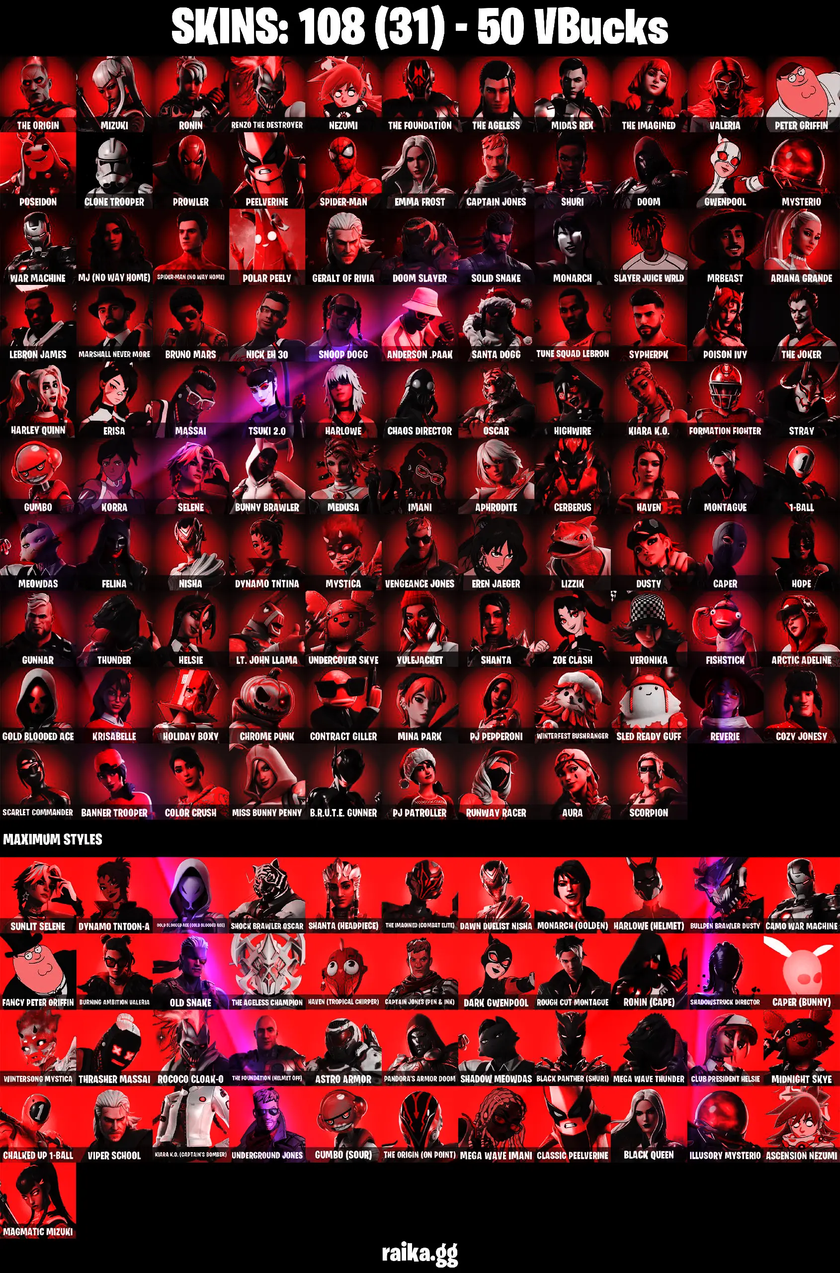 ๐โจOG OFFERโจ๐ 108 SKINS ๐ THE ORIGIN ๐ MIZUKI ๐ RONIN ๐ RENZO THE DESTROYER ๐ NEZUMI ๐ THE FOUNDATION ๐ THE AGELESS ๐ MIDAS REX ๐ THE IMAGINED ๐ VALERIA ๐ PETER GRIFFIN ๐ POSEIDON ๐ PEELVERINE ๐ SPIDER-MAN โก๏ธPC/PSN/XBOXโก๏ธ