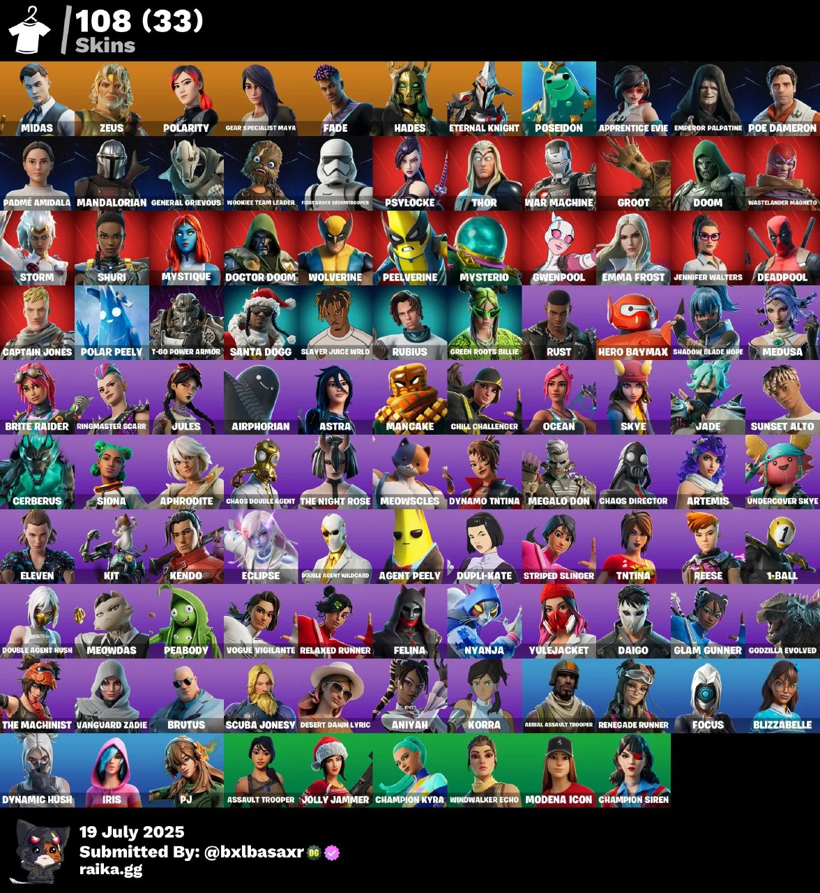 [PC] 108 skins | Aerial Assault Trooper | Midas | Zeus | Polarity | Gear Specialist Maya | Fade | Hades | Eternal Knight | Poseidon | Apprentice Evie | 10 VB