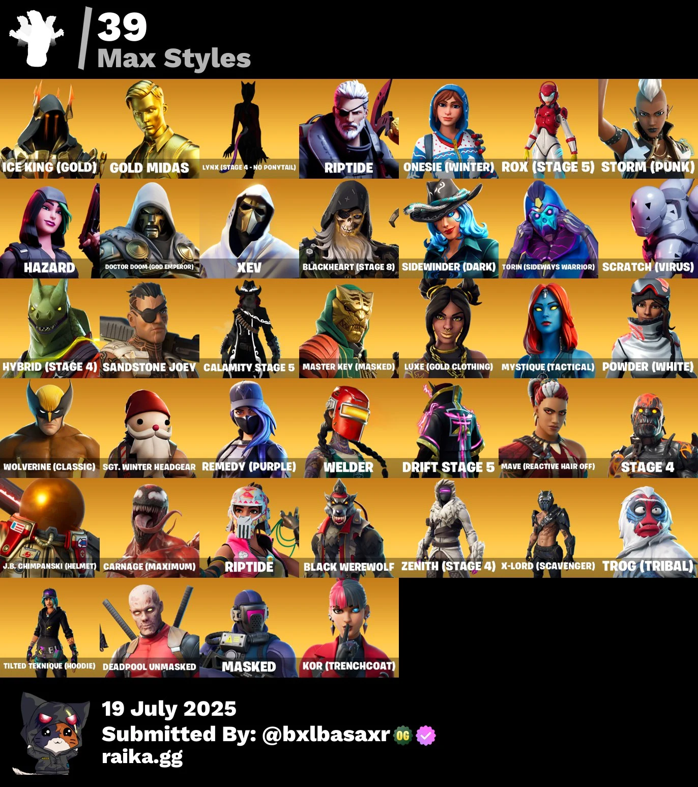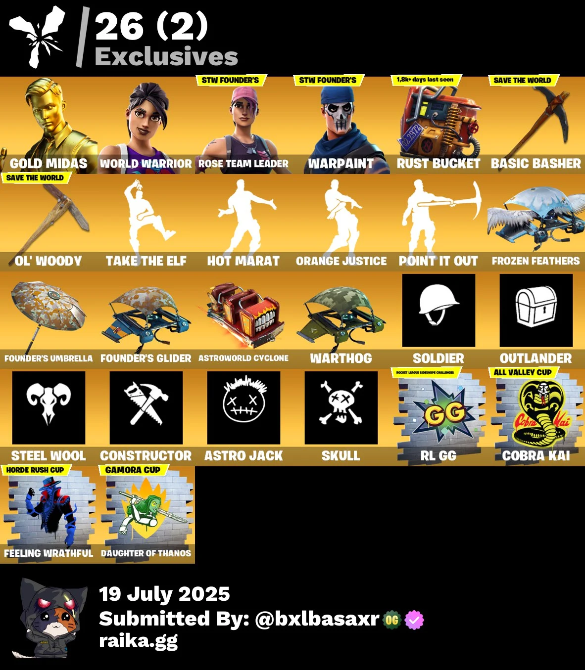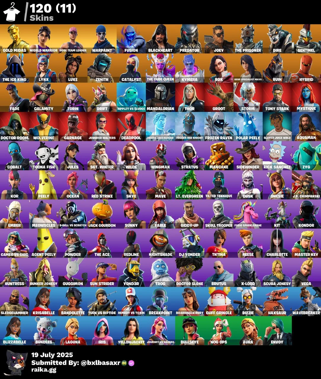[PC] 120 skins | OG STW | Gold Midas | World Warrior | Fusion | Blackheart | Predator | Joey | The Prisoner | Dire | Sentinel | The Ice King | Lynx | 100 VB