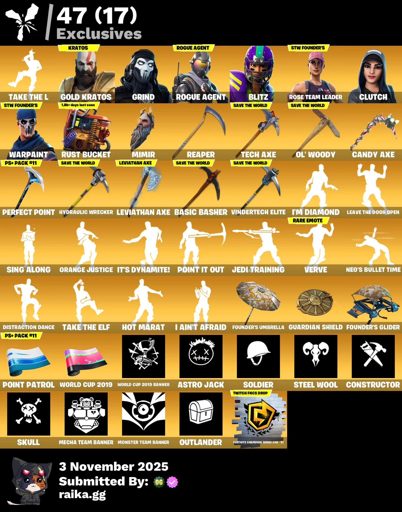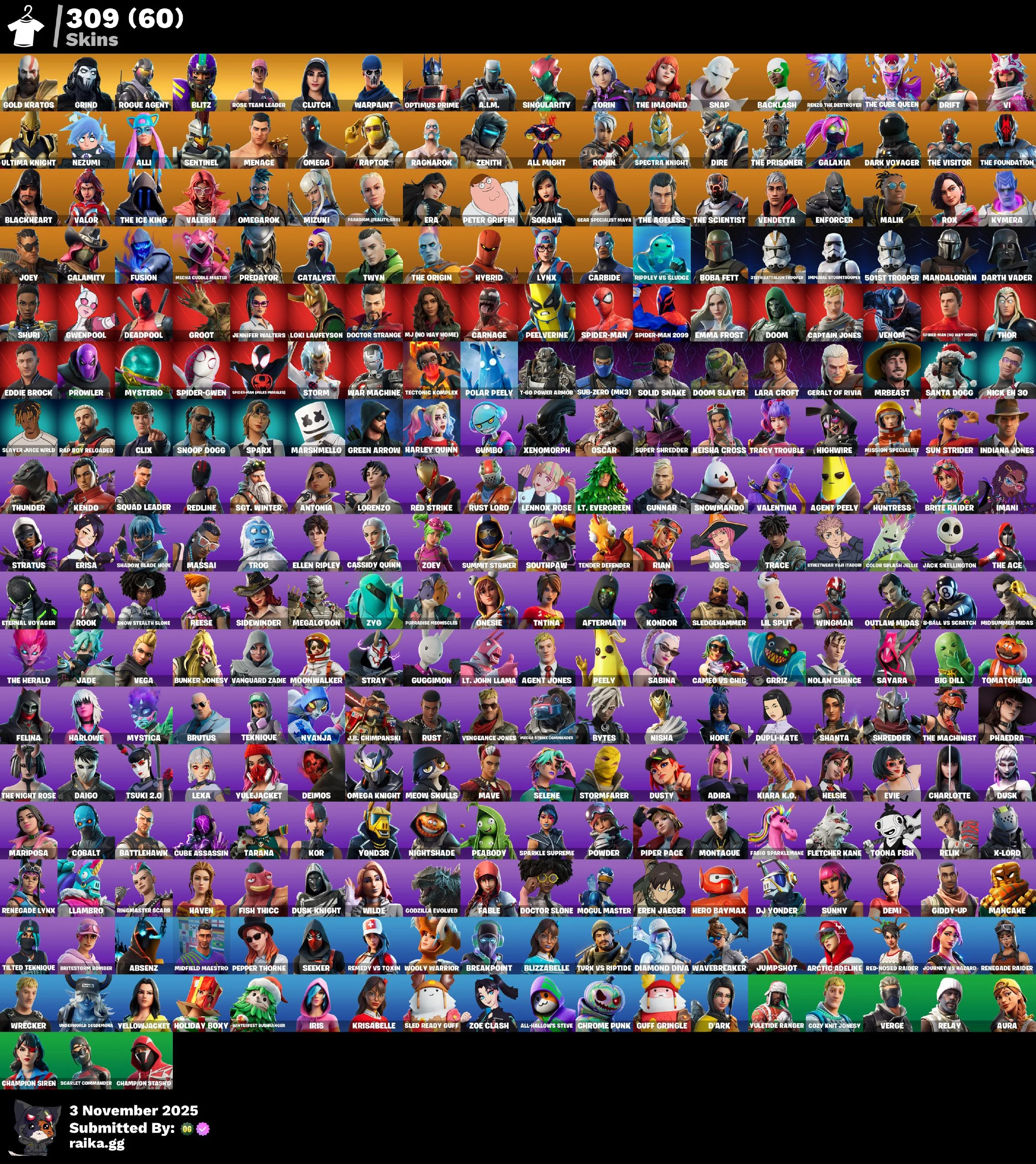 [PC] 309 skins | OG STW | Renegade Raider | Gold Kratos | Grind | Rogue Agent | Blitz | Clutch | Optimus Prime | A.I.M. | Singularity | Torin | Email Changeable!