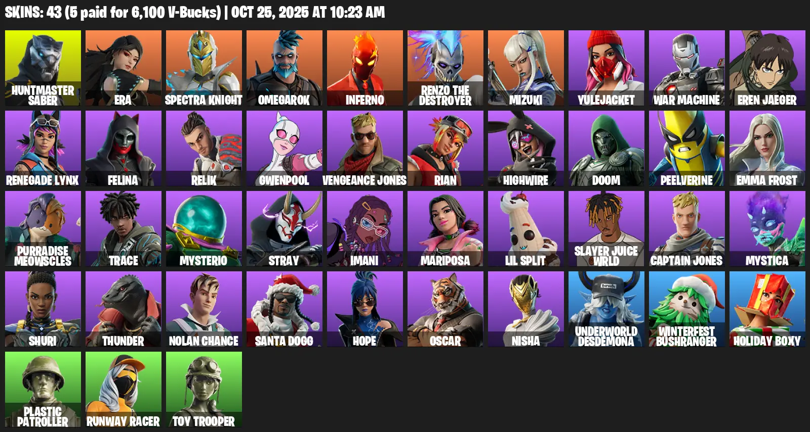 [PC/PSN] | 43 skins | Huntmaster Saber | Era | Spectra Knight | Omegarok | Inferno | Renzo the Destroyer | Mizuki | Yulejacket | #NQE6526 | #MBFN