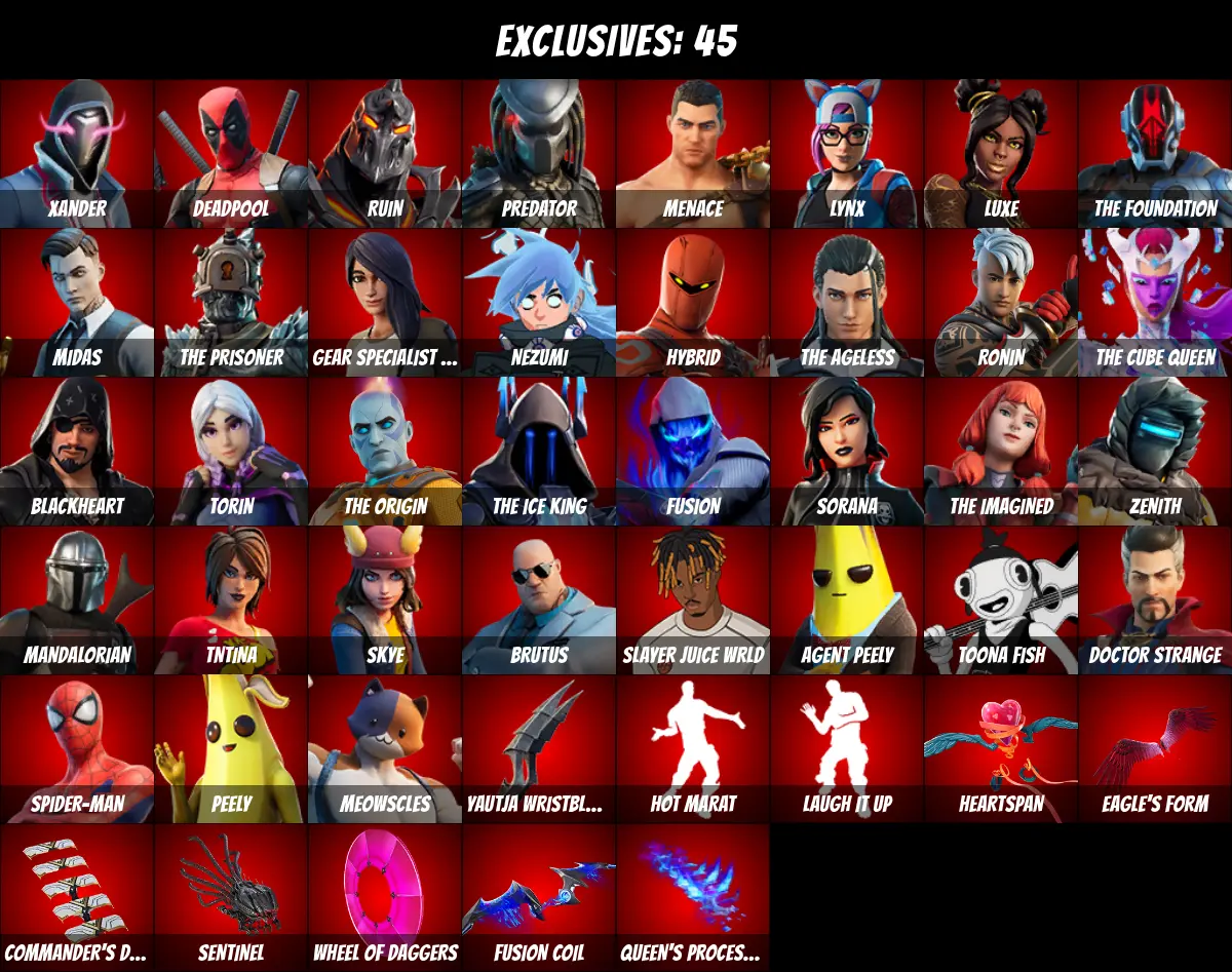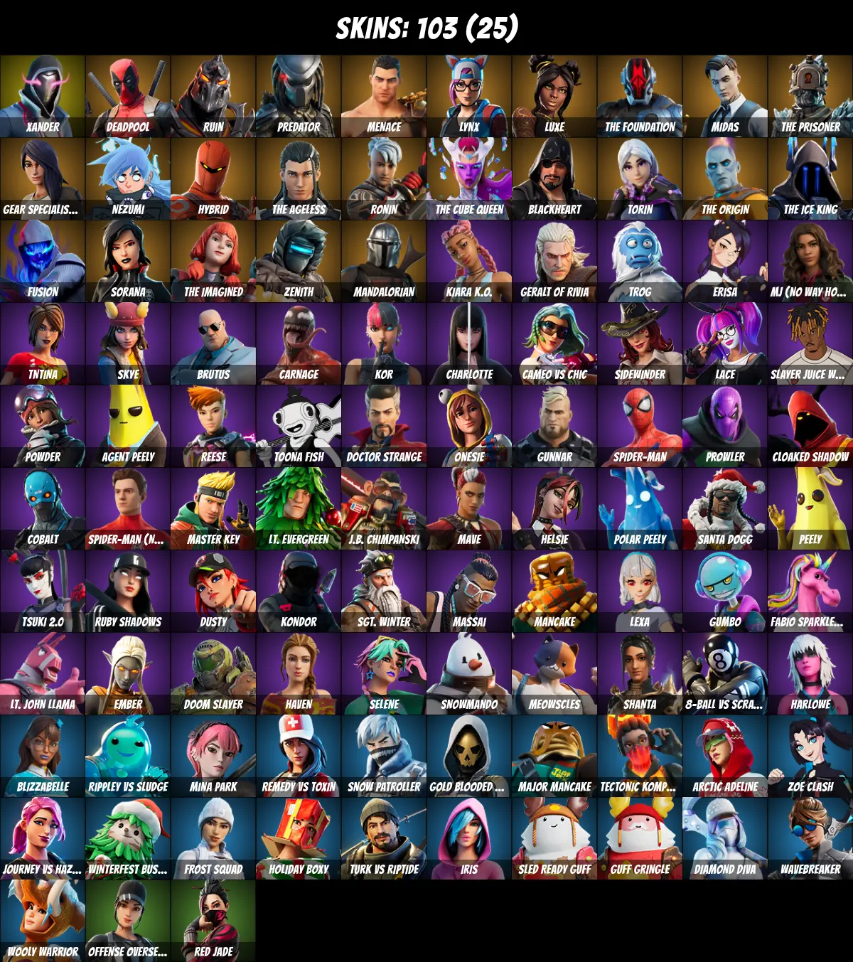 ⚡PC/PSN/XBOX⚡ 103 skins 💎 Kor 💎 Deadpool 💎 Midas 💎 Mandalorian 💎 Spider-Man (No Way Home) 💎 Lynx 💎 Peely 💎 Agent Peely 💎 Spider-Man 💎 The Ageless 💎 Toona Fish 💎 Meowscles 💎 Laugh It Up 💎 TNTina 💎 Brutus 💎 Doctor Strange 💎 Xander 💎 Ruin 💎 300 V-Bucks 💎
