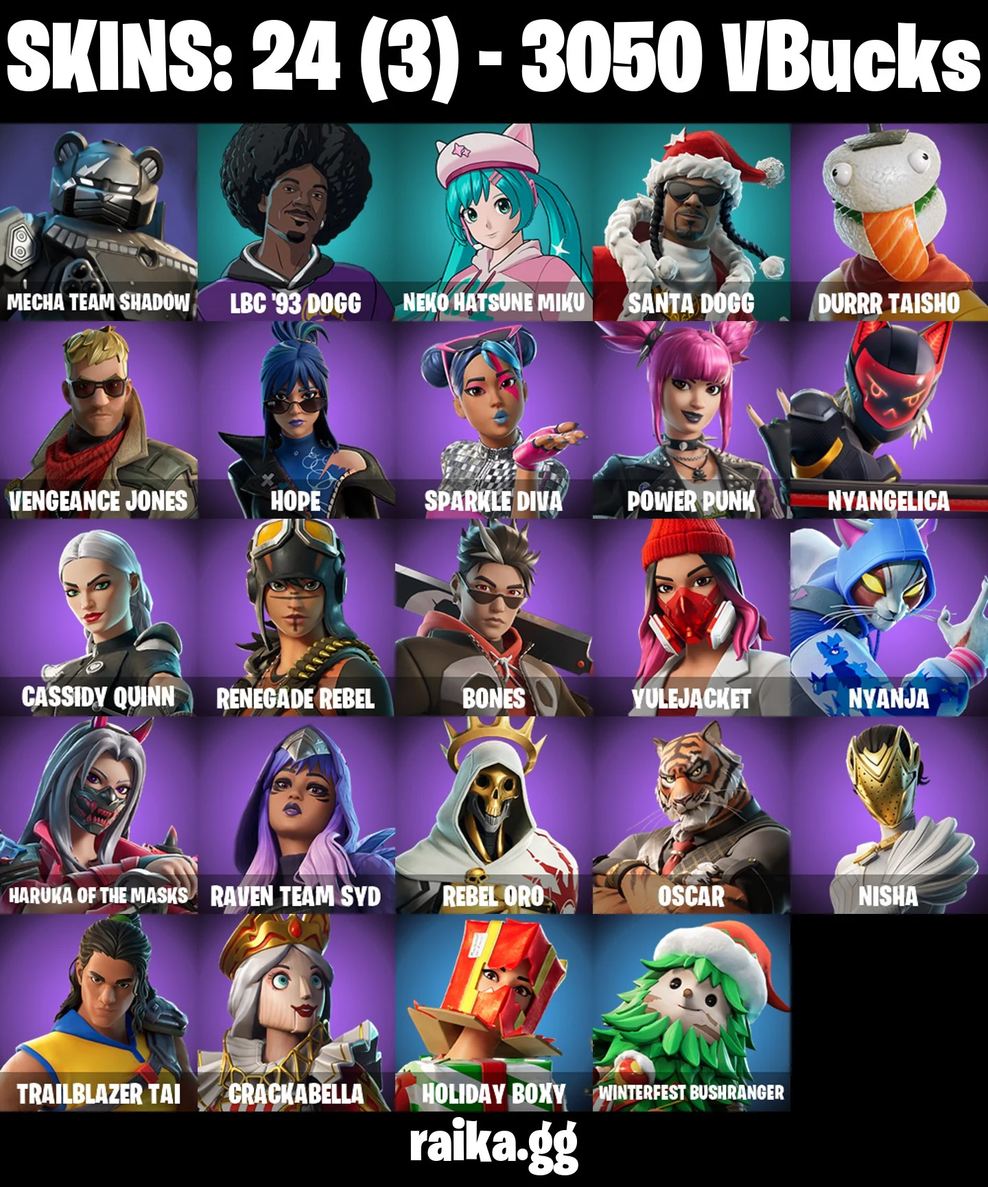 π¨ [PC/PSN/XBOX] π 24 skins | Mecha Team Shadow , LBC '93 Dogg , Neko Hatsune Miku , Santa Dogg , Durrr Taisho | π 3050 VBUCKS | βοΈ Changeable Email Now