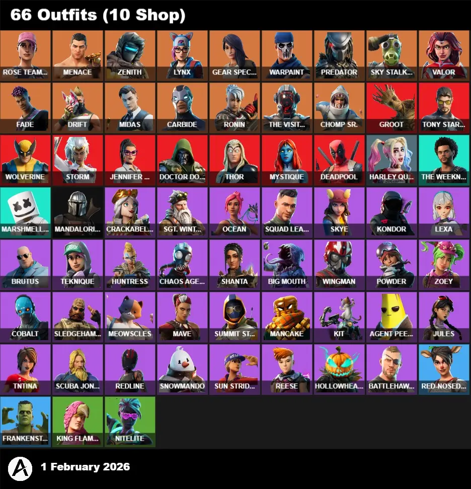| PC/PSN/XBOX | 66 Skins | OG STW | The Weeknd Combat | Marshmello | Menace | Zenith | Lynx | Gear Specialist Maya | Predator | Sky Stalker | Valor | Fade | Drift | Midas | Carbide | Ronin | The Vi...
