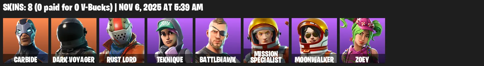 [PC/PSN/XBOX] | 8 skins | 800 V-bucks | Take The L | Carbide | Dark Voyager | Rust Lord | Teknique | Battlehawk | Mission Specialist | S4G