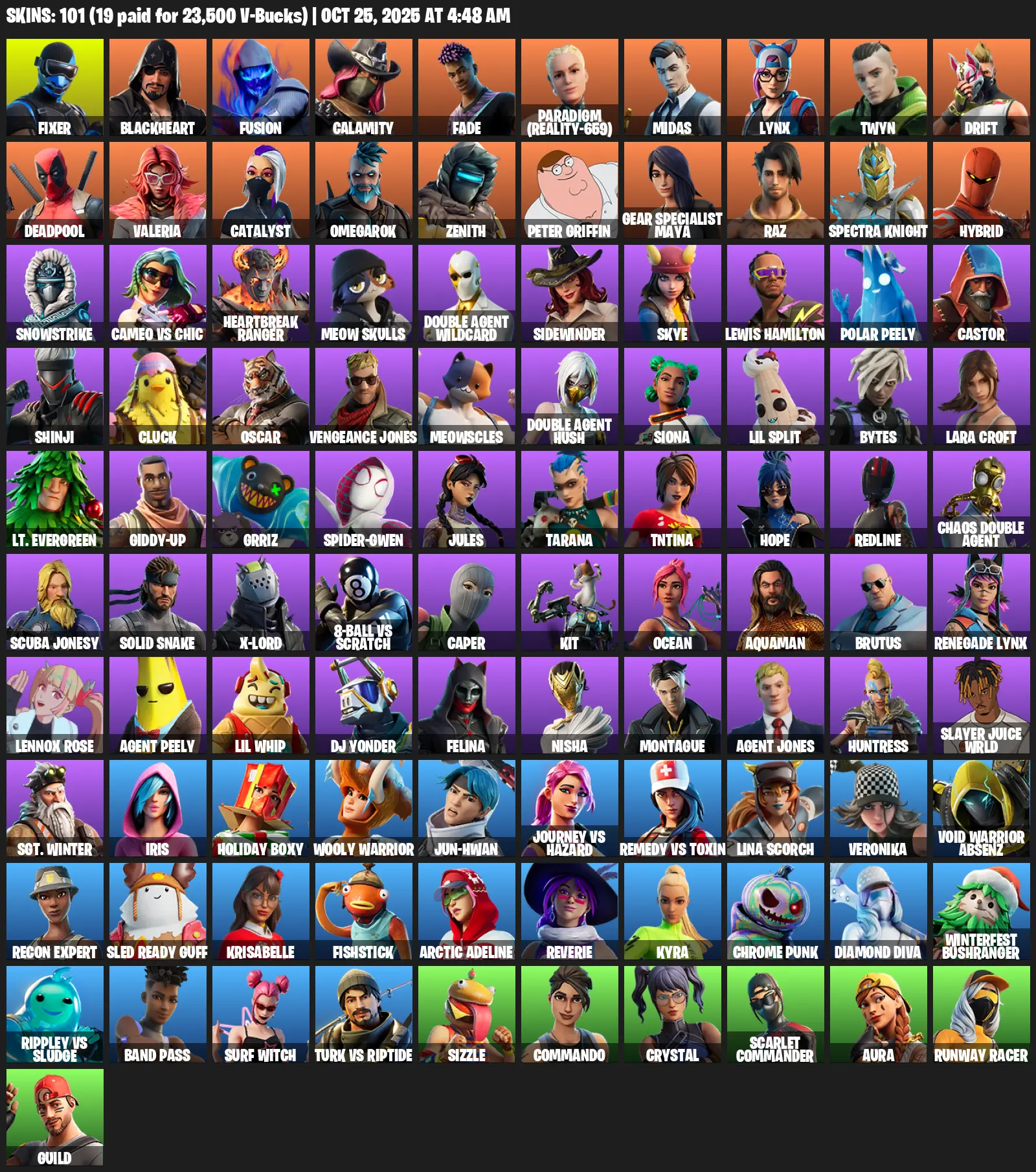 [PC/XBOX] | 101 skins | Lara Croft | Reaper Axe | Fixer | Blackheart | Fusion | Calamity | Fade | Paradigm (Reality-659) | Midas | Lynx | Twyn | S4G