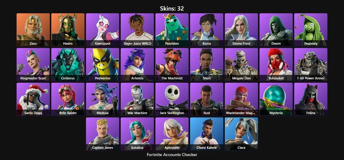 PC/XBOX 32 Skins⚡ | Zeus | Hades | Gwenpool | Slayer Juice WRLD | Poseidon | Korra | Emma Frost | Doom | Peabody | Ringmaster Scarr | Cerberus | Peelverine