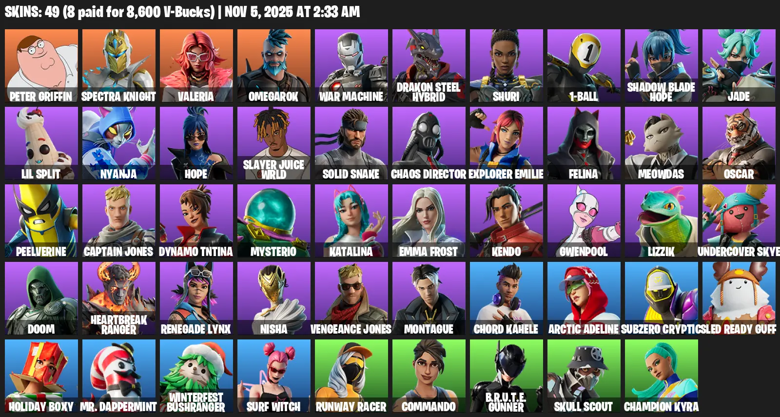 [PC/XBOX] | 49 skins | Reaper Axe | Peter Griffin | Spectra Knight | Valeria | Omegarok | War Machine | Drakon Steel Hybrid | Shuri | #KQQ1244 | #MBFN