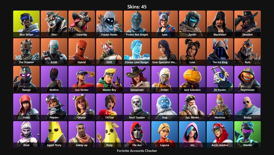 PC/XBOX/PSN 45 Skins⚡ | Skull Trooper | Peely | Blue Striker | Dire | Calamity | Frozen Raven | Frozen Red Knight | Lynx | Zenith | Blackheart | Deadfire