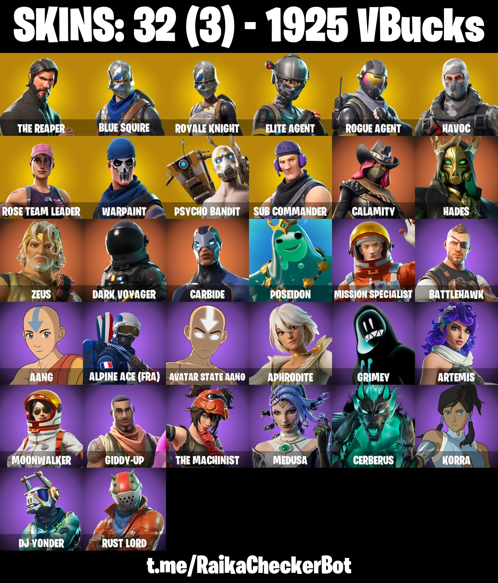 🎁✨ RARE ACCOUNT ✨🎁 32 SKINS 🌟 FLOSS 🌟 THE REAPER 🌟 BLUE SQUIRE 🌟 ROYALE KNIGHT 🌟 ELITE AGENT 🌟 MAKO 🌟 TAKE THE L 🌟 ROGUE AGENT 🌟 HAVOC 🌟 PSYCHO BANDIT 🌟 1925 VB 🌟 PSN/XBOX/PC
