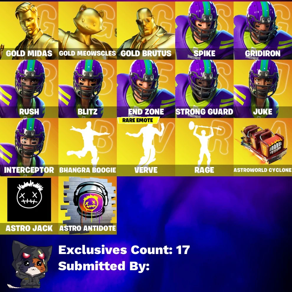 ππ₯ STACKED ACCOUNT π₯π 154 SKINS π RAIDER'S REVENGE π GOLD MIDAS π GOLD MEOWSCLES π GOLD BRUTUS π SPIKE π GRIDIRON π RUSH π BLITZ π END ZONE π STRONG GUARD π JUKE π INTERCEPTOR π BHANGRA BOOGIE π VERVE π RAGE π ASTROWORLD CYCLONE π 590 VB π FULL ACCESS π
