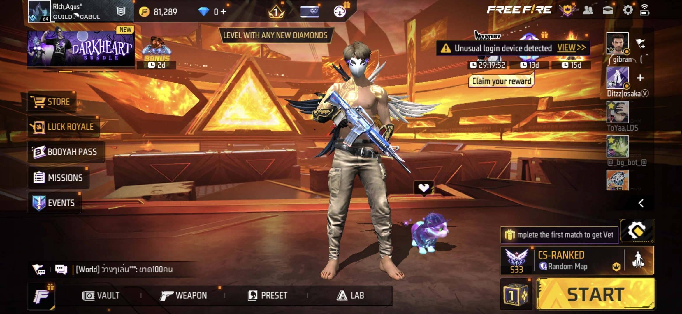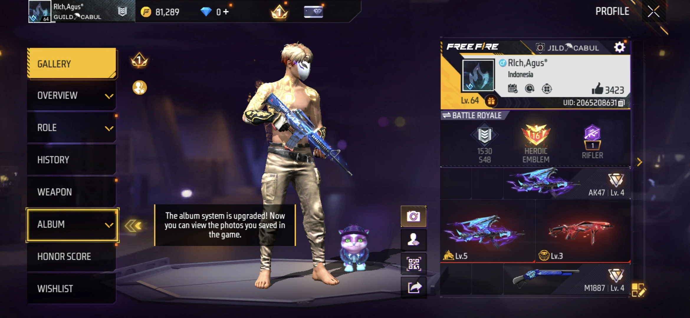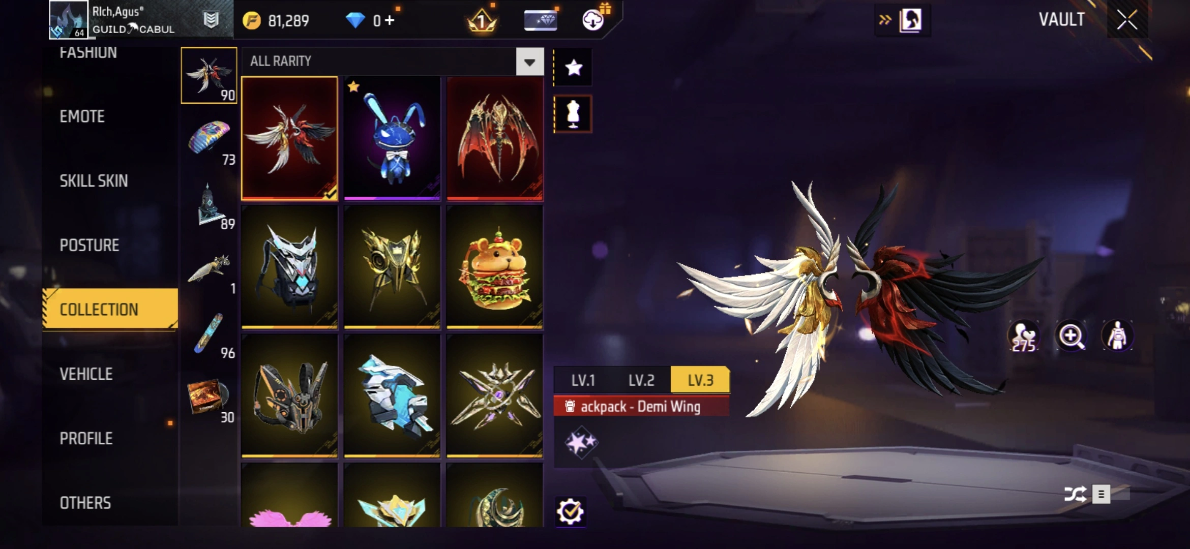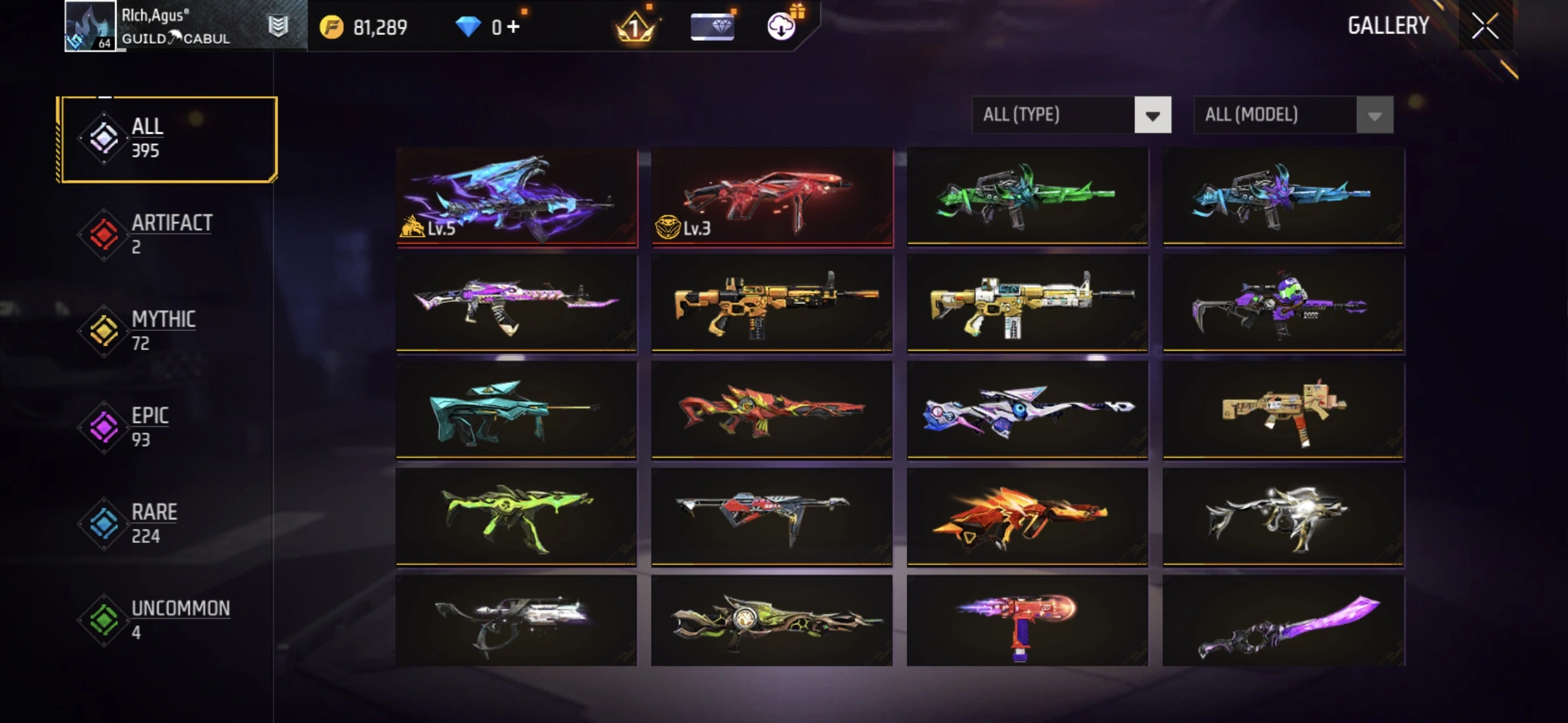 FF105|LV64/394 WEAPON (2 EVO + 72 Mythic)/MP40 ⸱ Predatory Cobra Lv. 3/AK47 ⸱ Blue Flame Draco Lv. 5/375 COSTUME (27 Mythic)/43 EMOT (12 Mythic)/90 BACKPACK (2 Artifact + 28 Mythic)/10 SPORTS CAR (1 Artifact + 1 Mythic)