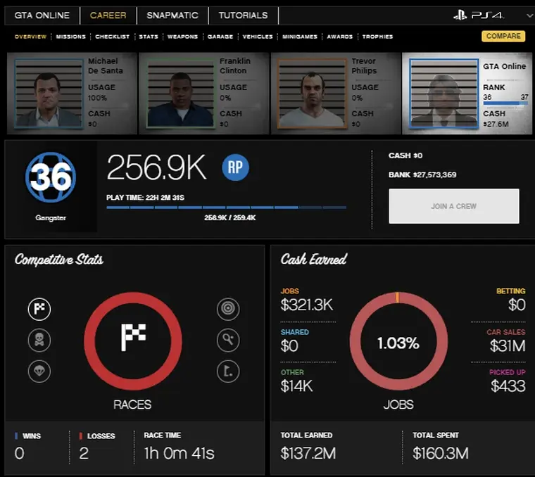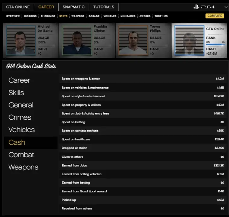 [PS4] Dual Character GTA 5 Modded Account ✦ Premium Online Vault ✦ 1.5 Billion (27M Cash + 506 Cars) | RP Rank 35 | Instant Delivery | Full Access | OF19