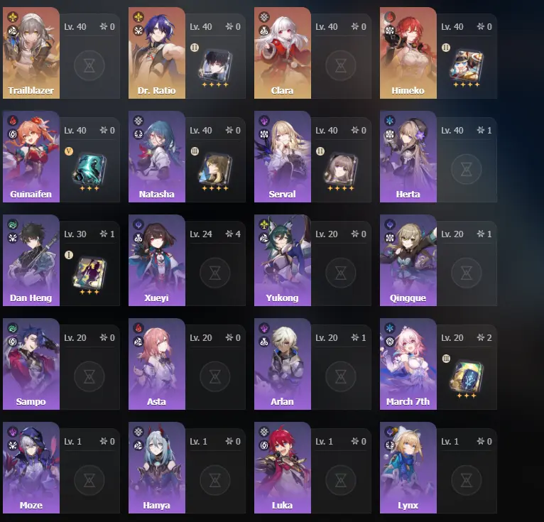 ๐ NA Server | ๐ฏ TL 27 | ๐ 20 Characters + 3 Legendaries | ๐ซ Trailblazer, Dr. Ratio, Clara, Himeko | ๐น Guinaifen, Natasha, Serval, Herta, Dan Heng, Xueyi, Yukong, Qingque, Sampo, Asta, Arlan, March 7th, Moze, Hanya, Luka, Lynx