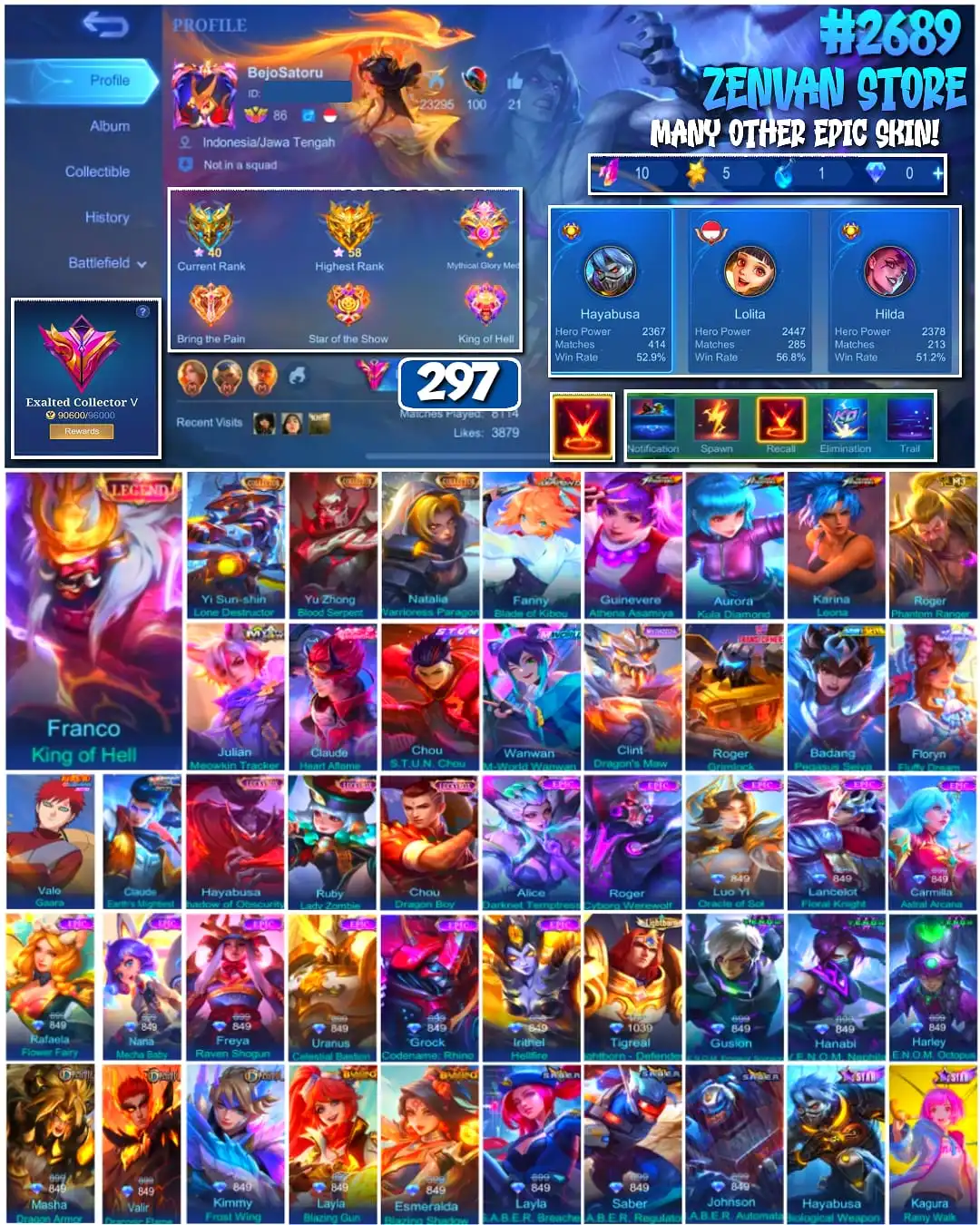 #2689 🔥 297 Skins 🔥 Legend Franco 🔥 Collector Yin Sun Shin, Yu Zhong & Natalia 🔥 Aspirant Fanny 🔥 Stun Chou 🔥 M-World Wanwan 🔥 Transformers Roger 🔥 🔥 Many Limited 🔥 Many Epic 🔥 Safe Account ✅