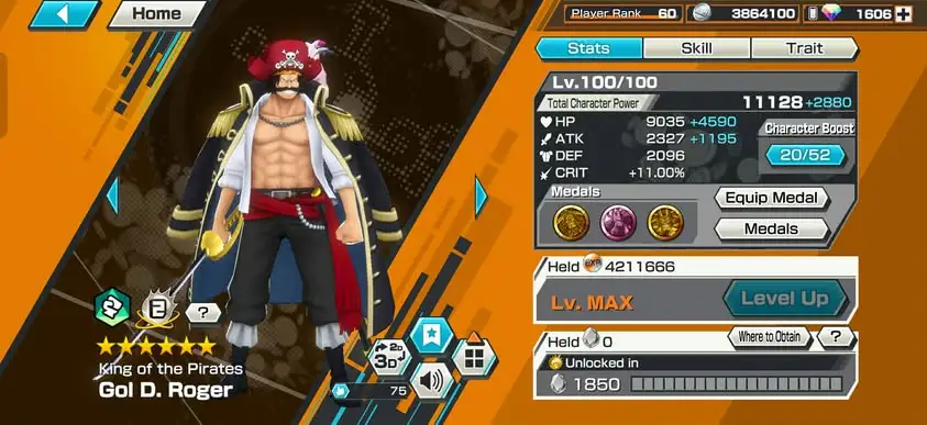 [4186][ ANDROID ONLY ] 10 EX / HB 61 / Nusjuro + Blackbeard + Light Luffy + Roger Dark + 2 Roger + Whitebeard + Kuzan + Zoro + Shanks, Many BFs / King + Kuma, 1606 Gems Android, Support 160%, Good Medal