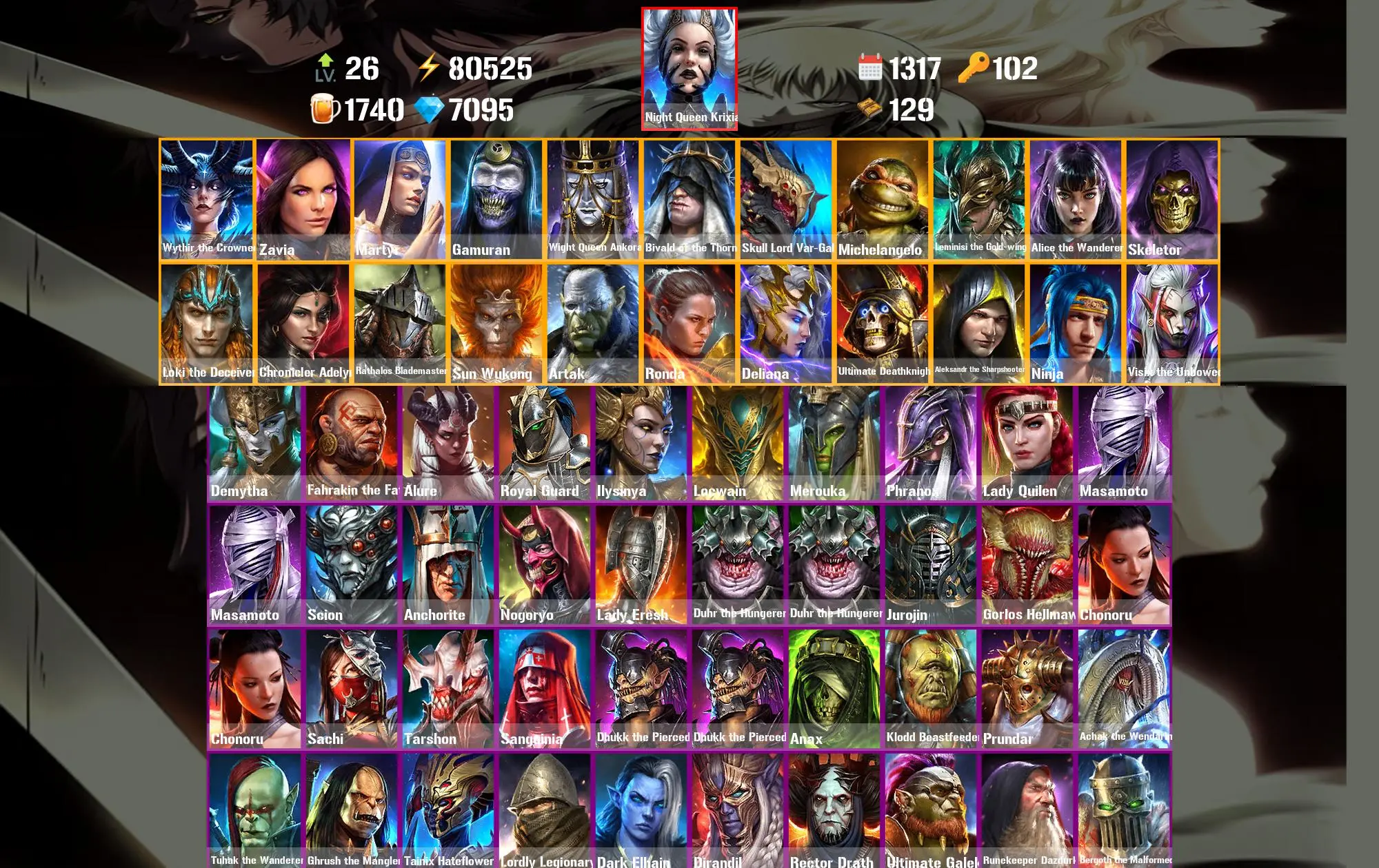 1317 Days 80.5k Energy [Mythical Starter] Night Queen Krixia ⸱ Wythir the Crowned ⸱ Zavia ⸱ Martyr ⸱ Gamuran ⸱ Wight Queen Ankora ⸱ Demytha ⸱ Fahrakin the Fat ⸱ 51.9m Silver ⸱ 7.1k Gems