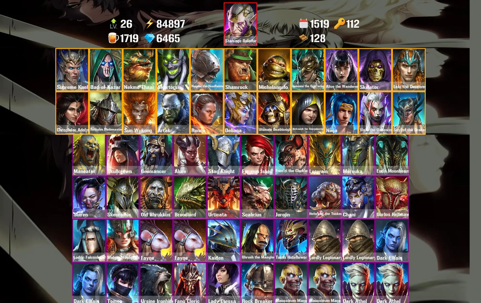 1519 Days 84.9k Energy [Mythical Starter] Starsage Galathir ⸱ Supreme Kael ⸱ Bad-el-Kazar ⸱ Nekmo Thaar ⸱ Skartorsis ⸱ Nogdar the Headhunter ⸱ Maneater ⸱ Skullcrown ⸱ 49.6m Silver ⸱ 6.5k Gems