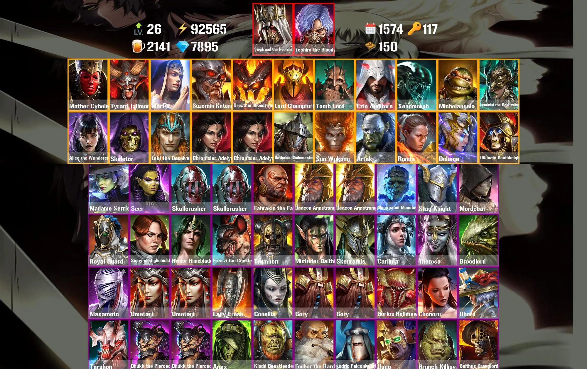 1574 Days 92.6k Energy [Mythical Starter] Siegfrund the Nephilim ⸱ Toshiro the Bloody ⸱ Mother Cybele ⸱ Tyrant Ixlimor ⸱ Martyr ⸱ Suzerain Katonn ⸱ Drexthar Bloodtwin ⸱ Madame Serris ⸱ Seer ⸱ 60.1m Silver ⸱ 7.9k Gems