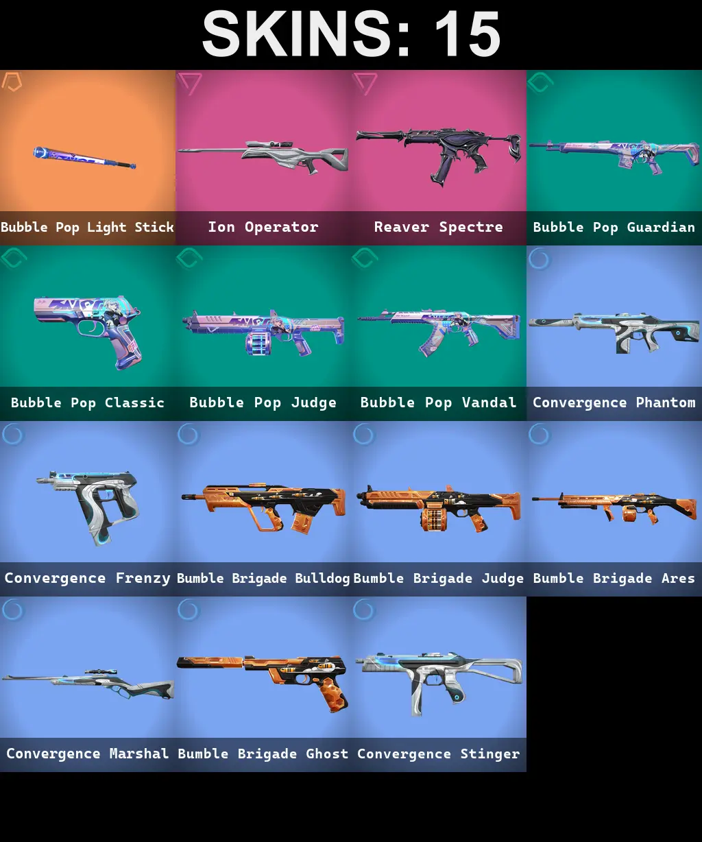❤️ 15 SKINS ❤️ 1 KNIFE ❤️ REAVER SPECTRE ❤️ ION OPERATOR ❤️ BUBBLE POP LIGHT STICK ❤️ BUBBLE POP GUARDIAN ❤️ BUBBLE POP CLASSIC ❤️ BUBBLE POP JUDGE ❤️ BUBBLE POP VANDAL ❤️ CONVERGENCE PHANTOM ❤️ CONVERGENCE FRENZY ❤️