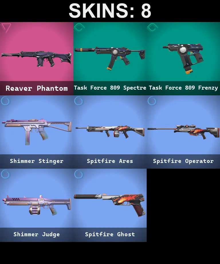8 SKINS | REAVER PHANTOM | TASK FORCE 809 SPECTRE | TASK FORCE 809 FRENZY | SHIMMER STINGER | SPITFIRE ARES | SPITFIRE OPERATOR | SHIMMER JUDGE | SPITFIRE GHOST | NA | RANKED READY |  3 AGENTS | FULL ACCESS | SCREENSHOTS INSIDE