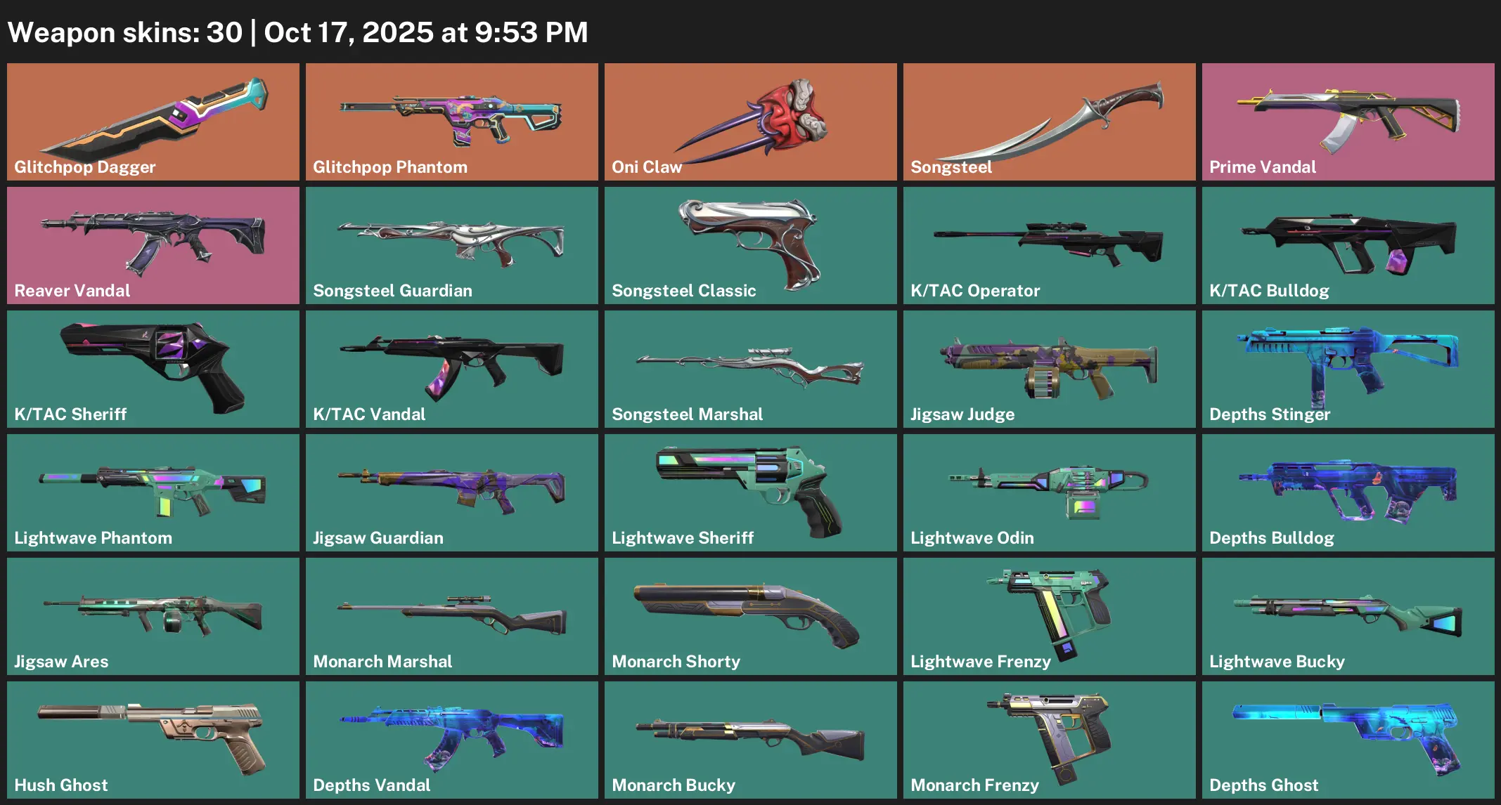 AP | 30 Skins | exp SILVER 1 | Glitchpop Dagger | Oni Claw | Prime Vandal | Reaver Vandal | Glitchpop Phantom | K/TAC Vandal | K/TAC Operator | S4G