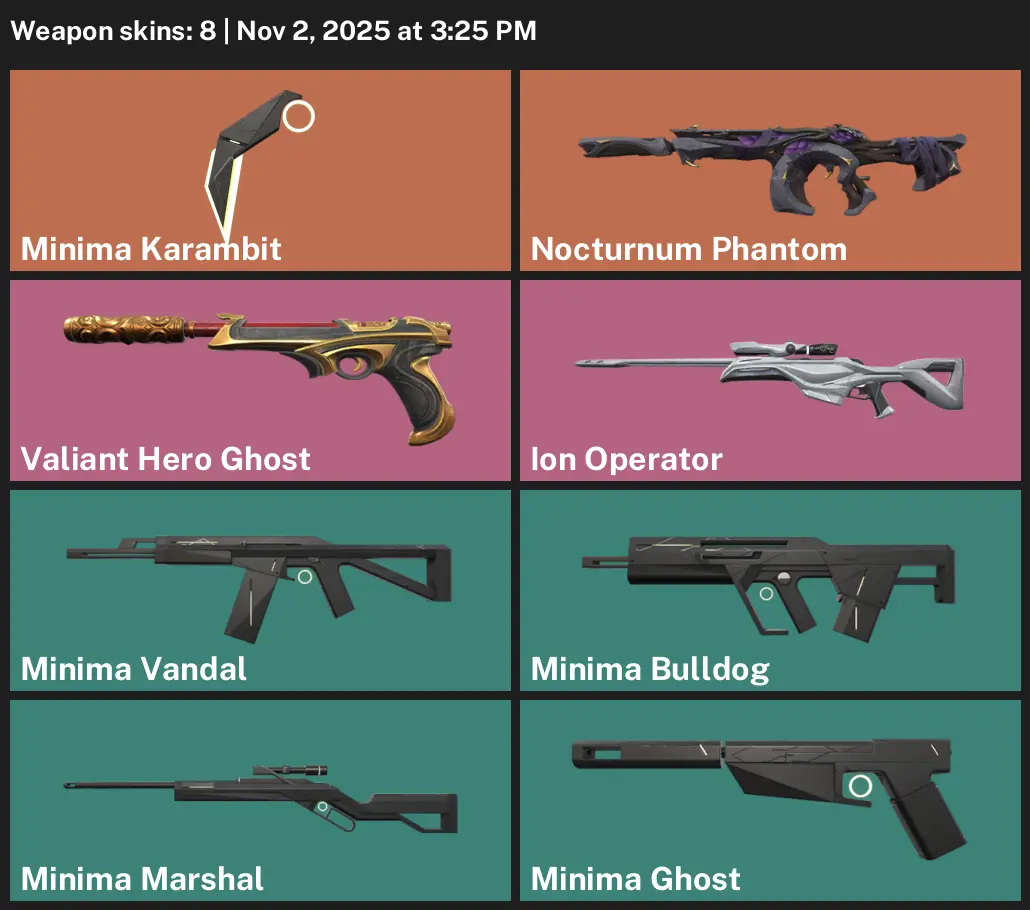 ๐ AP ๐บ Platinum 1 ๐ 8 Skins ๐งข 828 VP ๐ปโโ๏ธ 3 Agents ๐ฟ Value: 5725 VP ๐ซ Minima Karambit ๐โโ๏ธ Nocturnum Phantom ๐ Valiant Hero Ghost ๐ Ion Operator ๐  Minima Vandal ๐ฅง Minima Bulldog