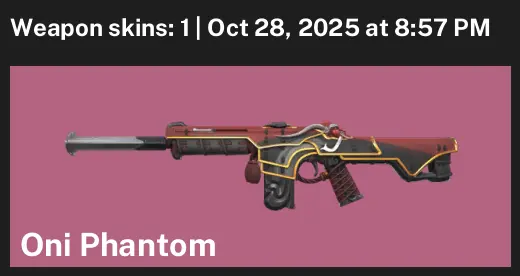 🎽 AP 🪇 Unranked 🔮 1 Skins 💻 75 VP 😔 8 Agents 😀 Value: 1775 VP 🚂 Oni Phantom