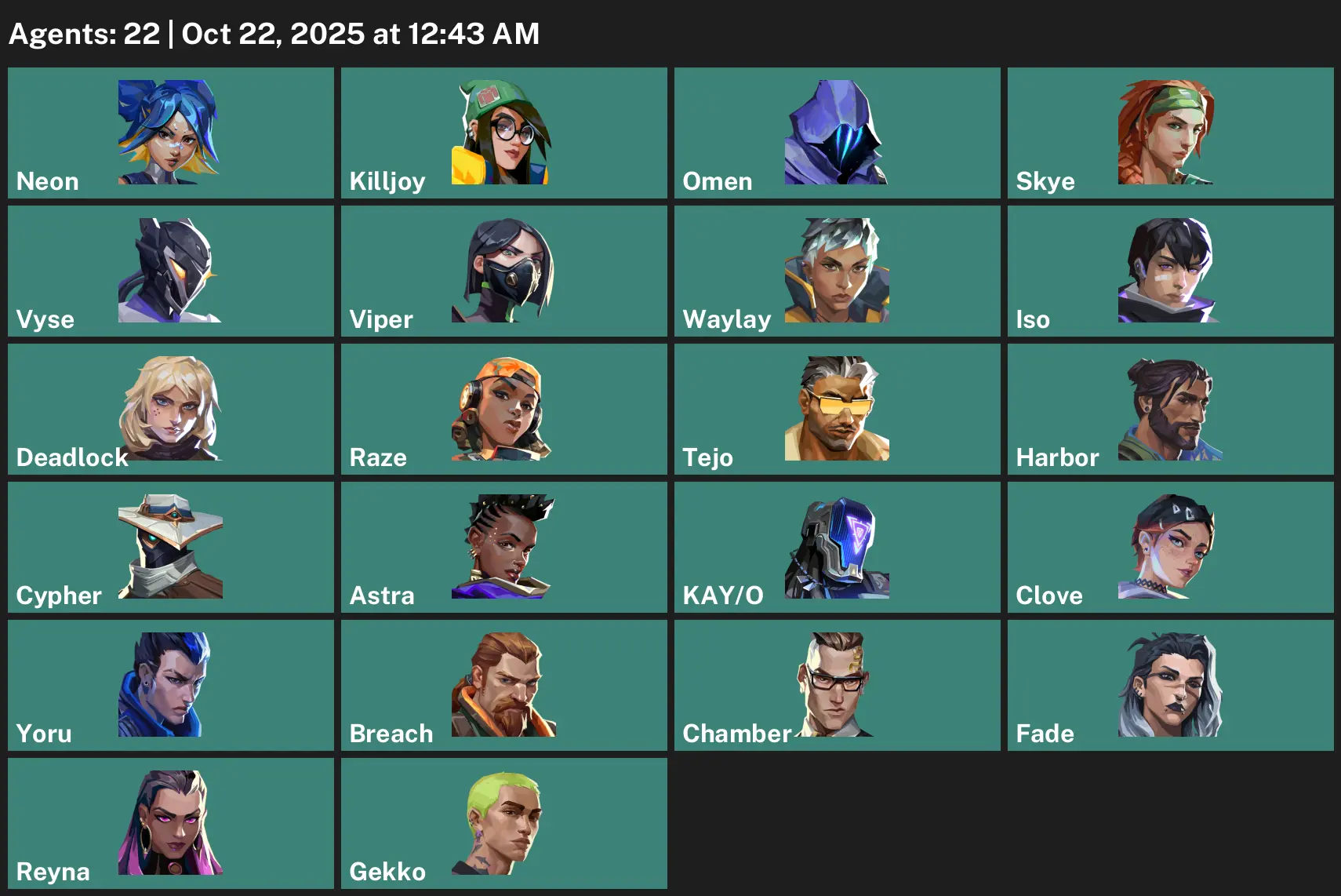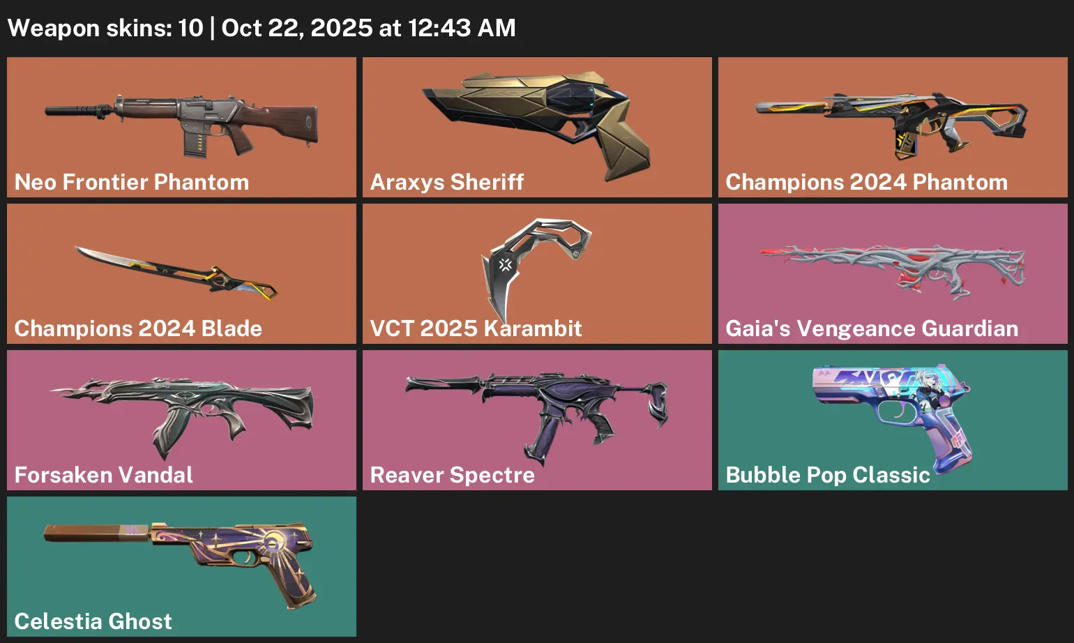 🥋 AP ⛪️ Unranked 📞 10 Skins 🦣 797 VP 🩰 22 Agents 🍸 Value: 15525 VP 🚃 Neo Frontier Phantom 🌾 Araxys Sheriff ☁️ Champions 2024 Phantom 🎳 Champions 2024 Blade 🏷 VCT 2025 Karambit 🔍 Gaia's Vengeance Guardian