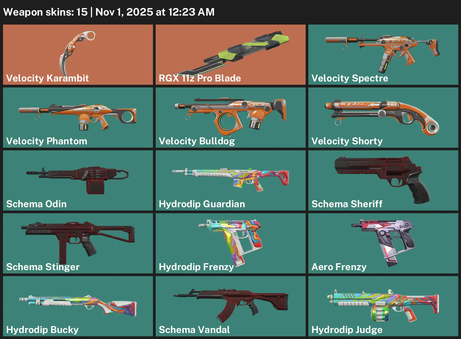 ๐น AP ๐ Unranked ๐ 15 Skins ๐คค 150 VP ๐ 13 Agents ๐ Value: 4350 VP ๐ฃ Velocity Karambit ๐ฅ RGX 11z Pro Blade ๐ฅ Velocity Spectre ๐ง Velocity Phantom ๐ฅ Velocity Bulldog ๐ Velocity Shorty