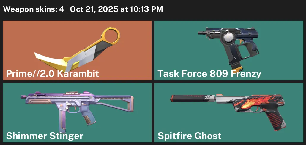 📓 AP 🧬 Unranked ⏳ 4 Skins 🏬 34 VP 🏋️♀️ 1 Agents 🔖 Value: 3550 VP 🚬 Prime//2.0 Karambit 🎺 Task Force 809 Frenzy 🧼 Shimmer Stinger 🍄 Spitfire Ghost