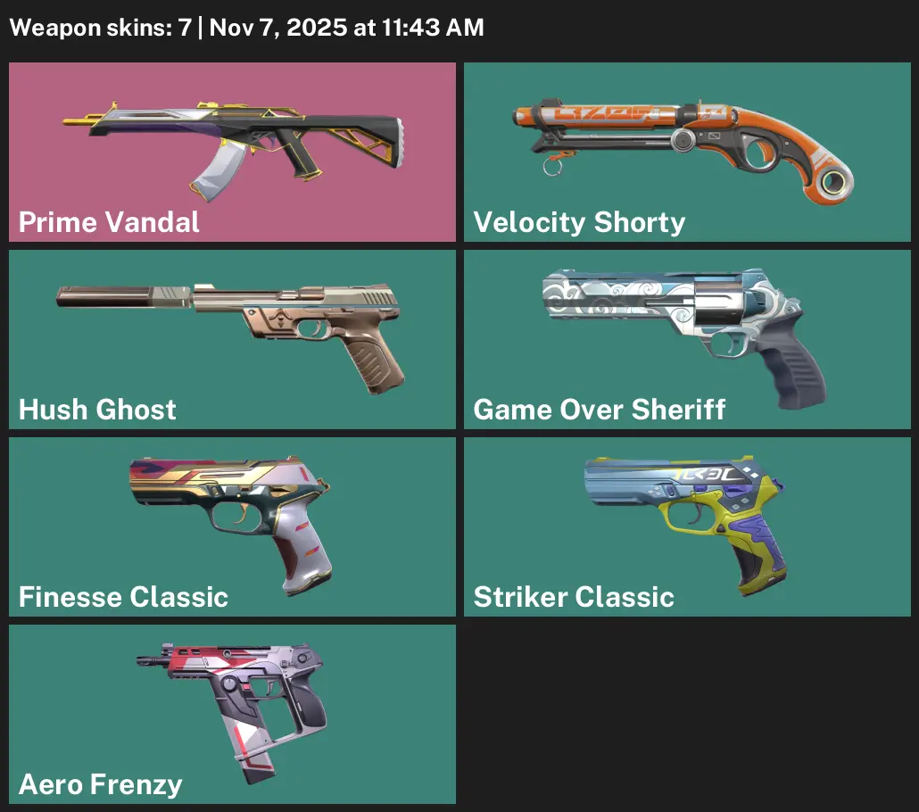 🫦 AP 💵 Unranked 🛁 7 Skins 📗 55 VP 🤪 15 Agents 🌏 Value: 1775 VP 🌱 Prime Vandal 😧 Velocity Shorty 😠 Hush Ghost 🧵 Game Over Sheriff 🌏 Finesse Classic 🧗 Striker Classic