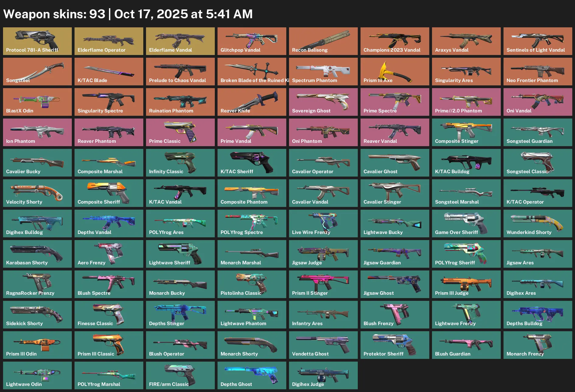 👓 AP ⛩ Unranked 😷 93 Skins 🧸 261 VP 🥈 19 Agents 🥕 Value: 63300 VP 😐 Protocol 781-A Sheriff 🚣♂️ Elderflame Operator 😹 Elderflame Vandal 🤤 Glitchpop Vandal 🦩 Recon Balisong 🧹 Champions 2023 Vandal