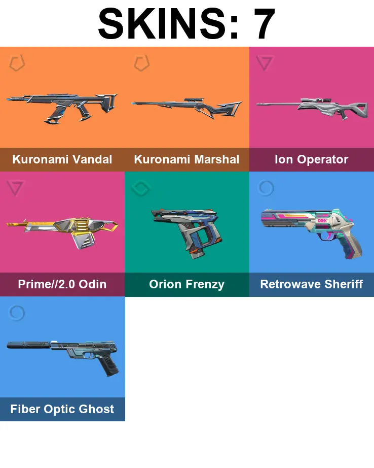 NA | 7 Skins | Kuronami Vandal | Kuronami Marshal | Ion Operator | Prime//2.0 Odin | Orion Frenzy | Retrowave Sheriff | Fiber Optic Ghost | 2x Iron Buddy + 2x Bronze Buddy